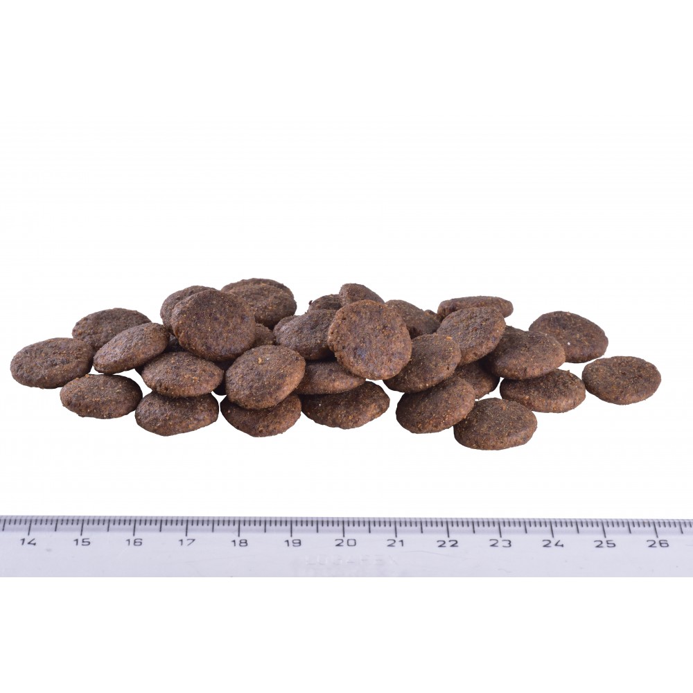 Поживні речовини: сирий протеїн 29,0%, сирий жир 13,0%, сира клітковина 2,5%, сира зола 6,0%, волога 10%, Омега-3 3,3%, Омега-6 1,9%, Ейкозапентаенова кислота (20:5 n-3) 0,40%, Докозагексаєнова кислота (22:6 n-3) 0,55%, кальцій 0,8%, фосфор 0,6%, натрій 0,6%, магній 0,08%, вітамін E 500 мг/кг.