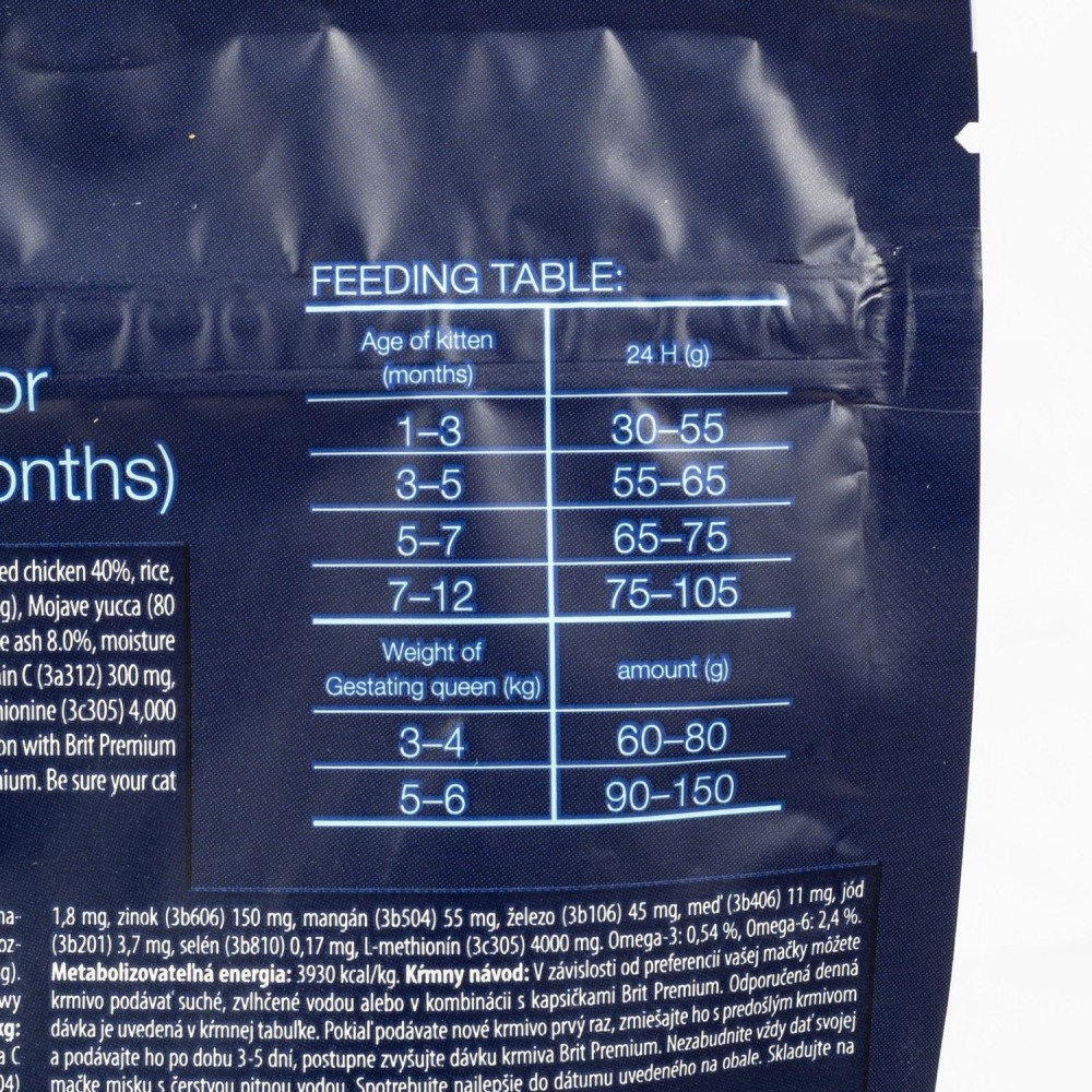 Харчові добавки на 1 кг: вітамін А (3a672a) 22000 МО, вітамін D3 (3a671) 900 МО, вітамін E (3a700) 700 мг, вітамін C (3a312) 300 мг, таурин (3a370) 2300 мг, біотин (3a880) 1,8 мг, цинк (3b606) 150 мг, марганець (3b504) 55 мг, залізо (3b106) 45 мг, мідь (3b406) 11 мг, йод (3b201) 3,7 мг, селен (3b810) 0,17 мг, L -метіонін (3c305) 4000 мг. Омега-3: 0,54%, Омега -6: 2,4%.