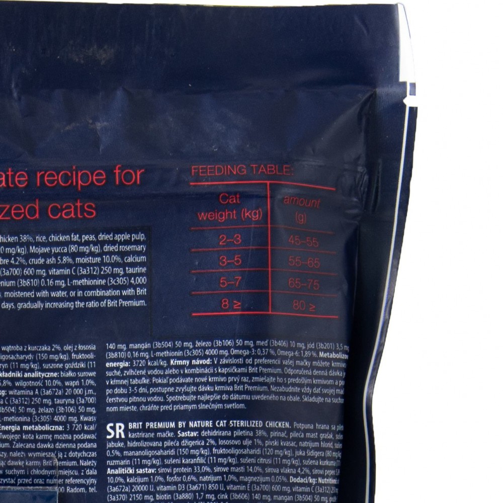 Харчові добавки на 1 кг: вітамін А (3a672a) 20000 МО, вітамін D3 (3a671) 850 МО, вітамін E (3a700) 600 мг, вітамін C (3a312) 250 мг, таурин (3a370) 2150 мг, біотин (3a880) 1,7 мг, цинк (3b606) 140 мг, марганець (3b504) 50 мг, залізо (3b106) 50 мг, мідь (3b406) 10 мг, йод (3b201) 3,5 мг, селен (3b810) 0,16 мг, L-метіонін (3c305) 4000 мг. Омега-3: 0,37%, Омега -6: 1,89%.
