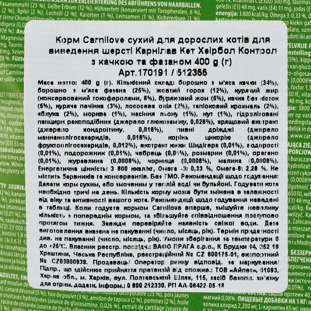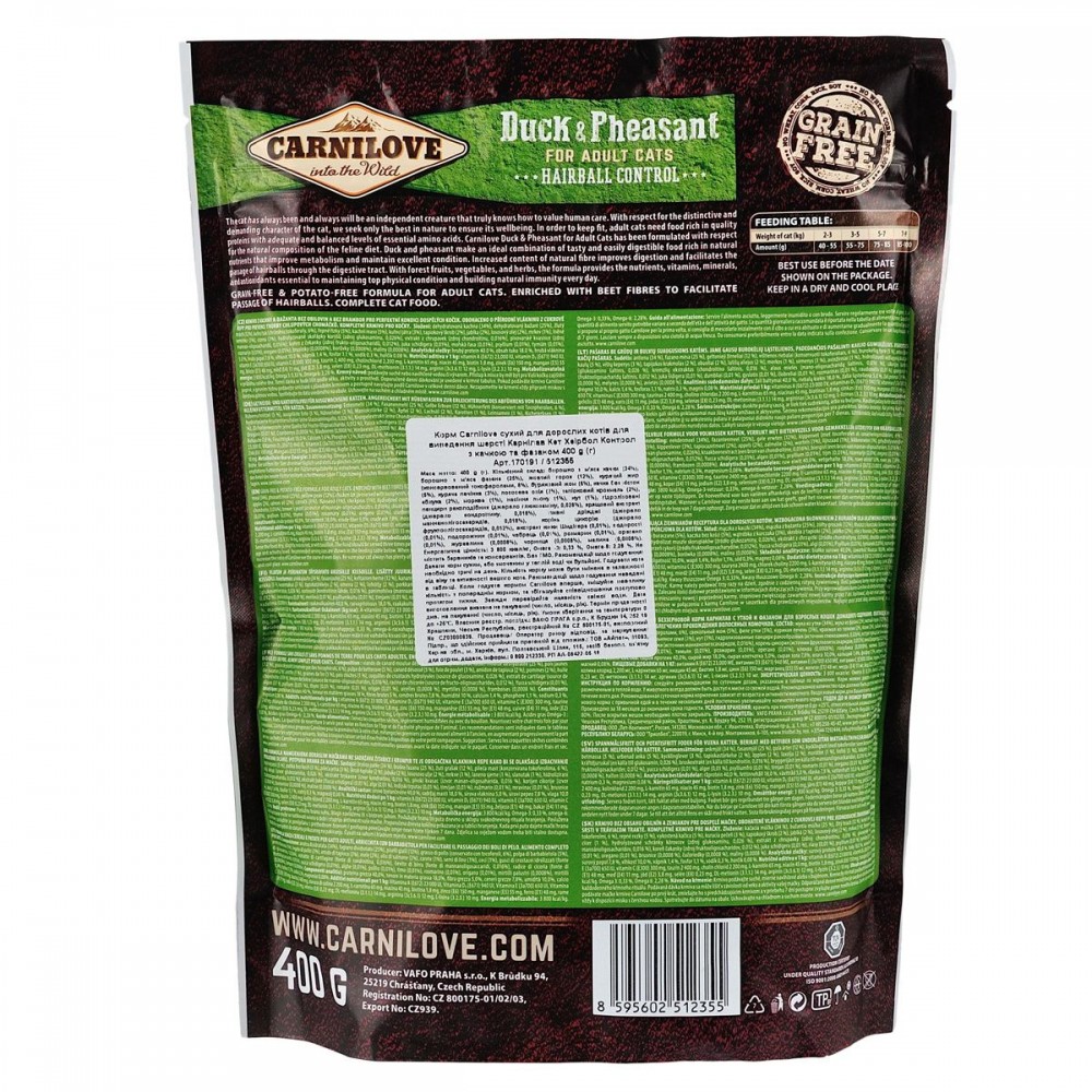 Качка та фазан — ідеальне поєднання смачної та легкозасвоюваної їжі, що багата на природні поживні речовини і сприяє покращенню метаболізму і підтриманню відмінної фізичної форми. Підвищений вміст натуральної клітковини покращує травлення та полегшує проходження кульок шерсті через травний тракт. Корм містить лісові плоди, овочі та трави, щоденно забезпечуючи ваших улюбленців поживними речовинами, вітамінами, мінералами та антиоксидантами, необхідними для підтримання відмінної фізичної форми і чудового природного імунітету.