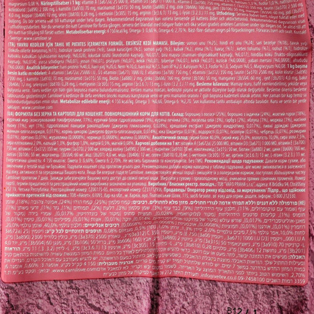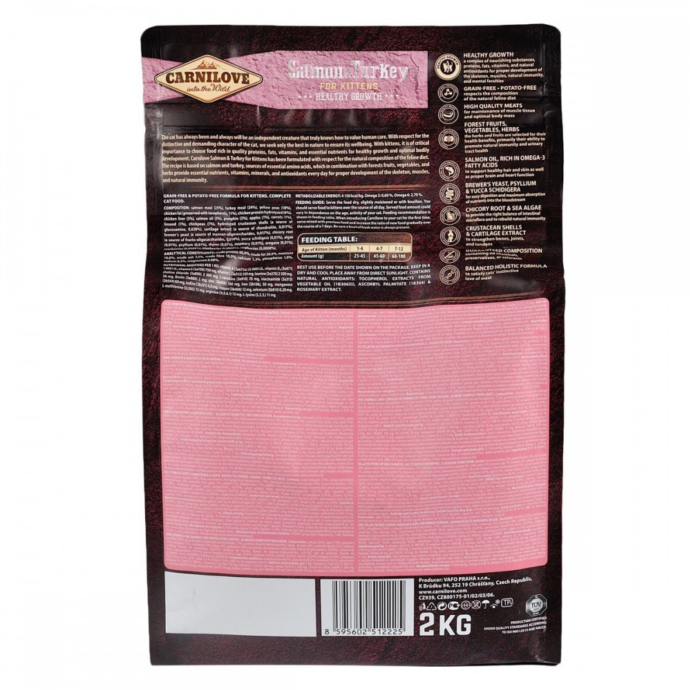 Корм Carnilove Salmon & Turkey для кошенят створений з урахуванням природного раціону кішок в дикій природі. Основа корму - лосось і індичка, джерела незамінних амінокислот. У складі корму також міститься комбінація лісових фруктів, овочів і трав, які щодня є джерелами необхідних поживних речовин, вітамінів, мінералів і антиоксидантів для здорового розвитку скелета, м'язів і імунної системи.