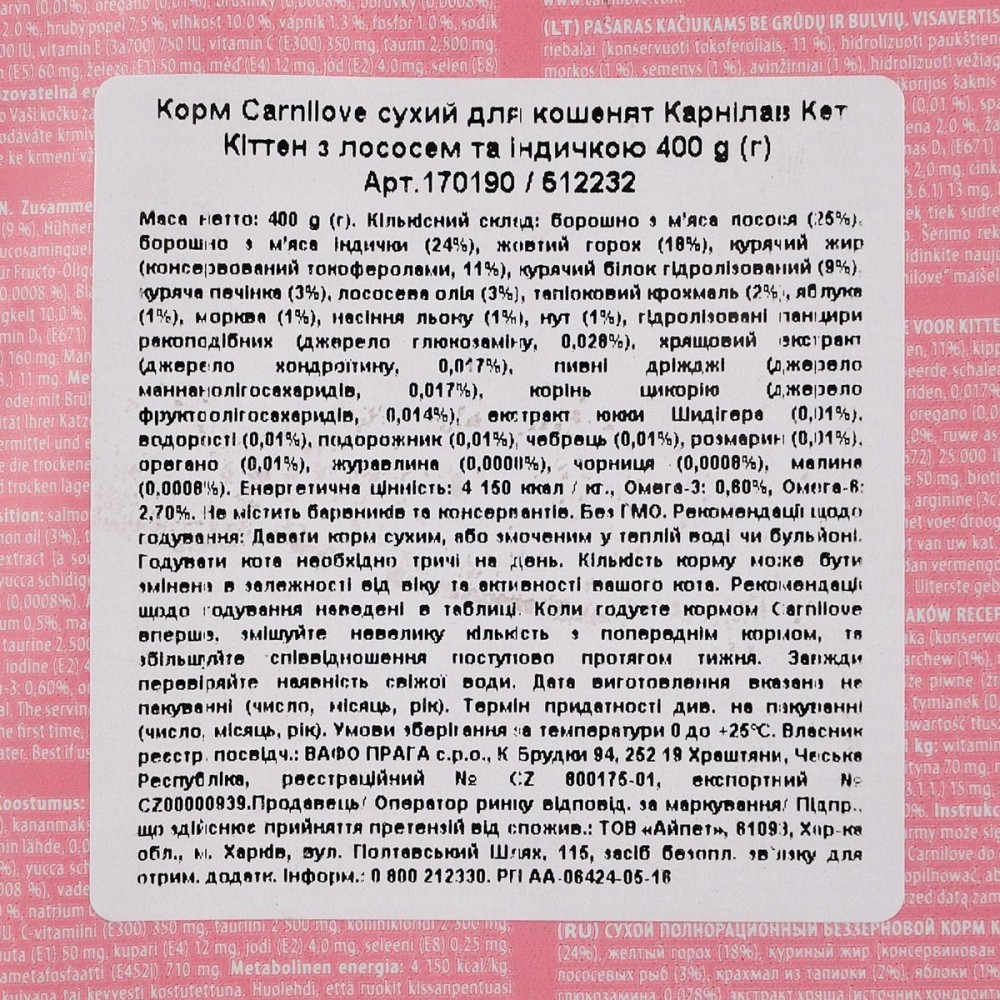 Корм Carnilove Salmon & Turkey для кошенят створений з урахуванням природного раціону кішок в дикій природі. Основа корму - лосось і індичка, джерела незамінних амінокислот. У складі корму також міститься комбінація лісових фруктів, овочів і трав, які щодня є джерелами необхідних поживних речовин, вітамінів, мінералів і антиоксидантів для здорового розвитку скелета, м'язів і імунної системи.