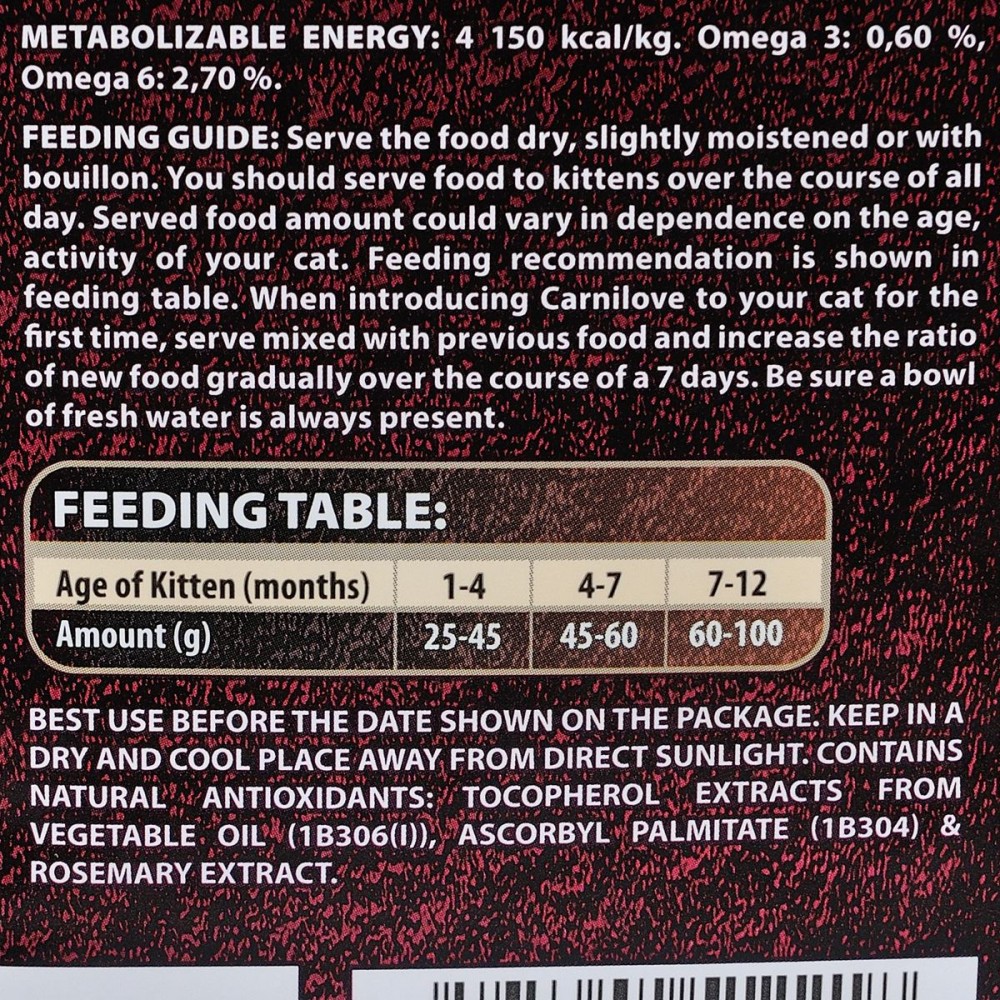 Корм Carnilove Salmon & Turkey для кошенят створений з урахуванням природного раціону кішок в дикій природі. Основа корму - лосось і індичка, джерела незамінних амінокислот. У складі корму також міститься комбінація лісових фруктів, овочів і трав, які щодня є джерелами необхідних поживних речовин, вітамінів, мінералів і антиоксидантів для здорового розвитку скелета, м'язів і імунної системи.
