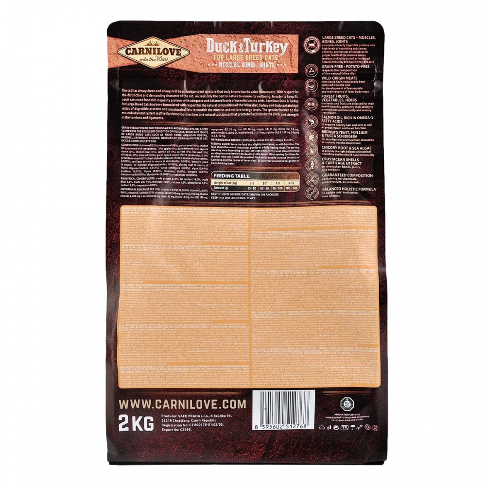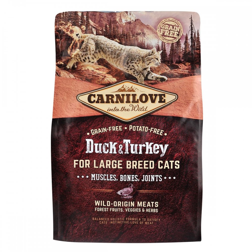 Щоб зберегти відмінну форму, дорослим кішкам необхідна якісна білкова їжа зі збалансованим рівнем незамінних амінокислот. Корм Carnilove Duck & Turkey для кішок великих порід створений з урахуванням природного раціону кішок в дикій природі.