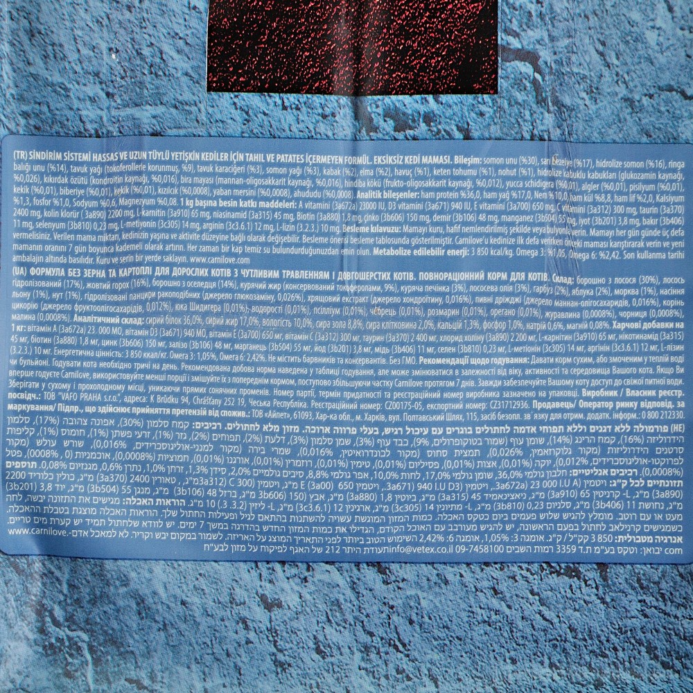 Харчові добавки на 1 кг: вітамін A (3a672a) 23 000 МО, вітамін D3 (3a671) 940 МО, вітамін E (3a700) 650 мг, вітамін C (3a312) 300 мг, таурин (3a370) 2 400 мг, холіну хлорид (3a890) 2 200 мг, L-карнітин (3a910) 65 мг, ніацинамід (3a315) 45 мг, біотин (3a880) 1,8 мг, цинк (3b606) 150 мг, залізо (3b106) 48 мг, марганець (E5) 55 мг, йод (3b201) 3,8 мг, мідь (3b406) 11 мг, селен (3b810) 0,23 мг, L-метіонин (3c305) 14 мг, аргінін (3c3.6.1) 12 мг, L-лізин (3.2.3.) 10 мг.