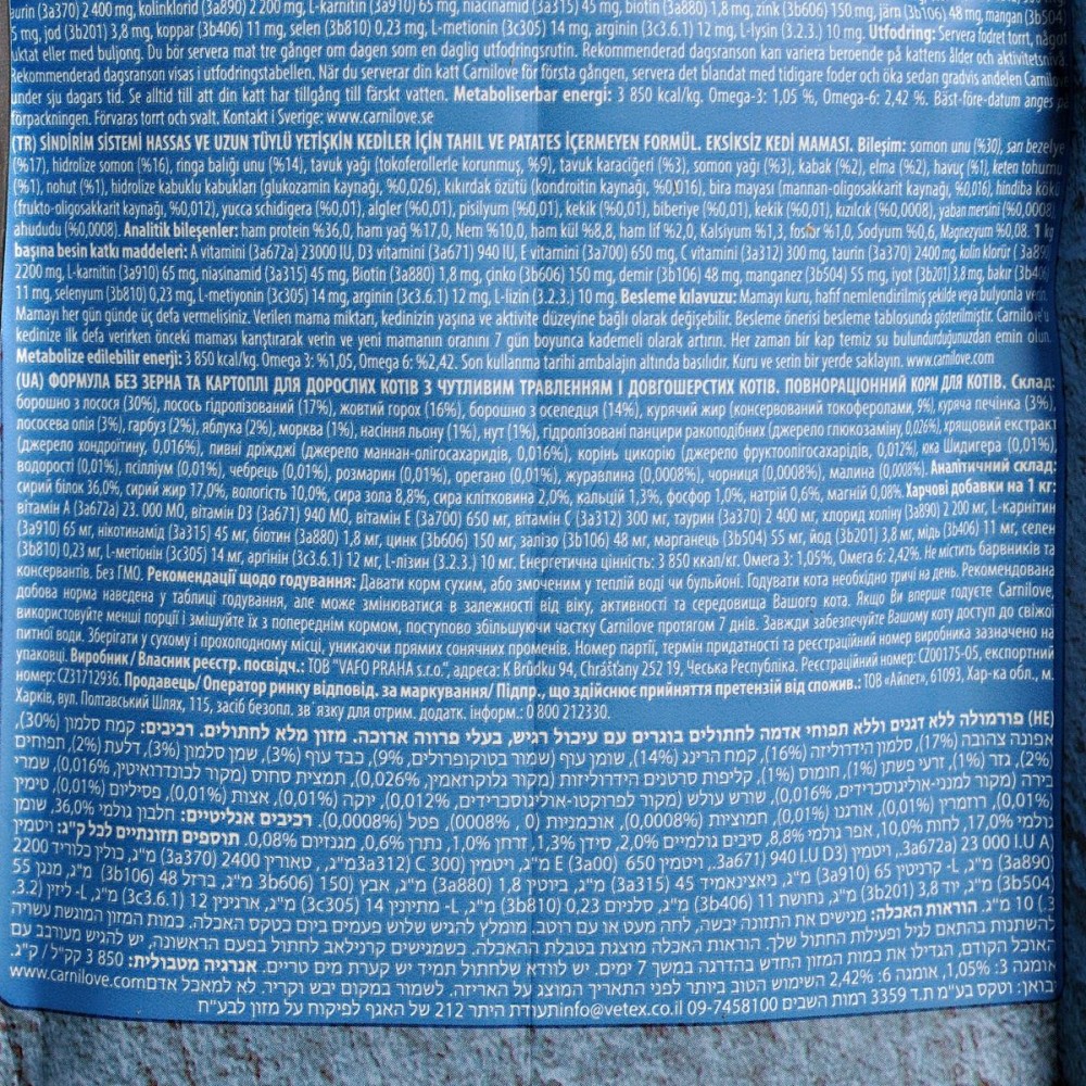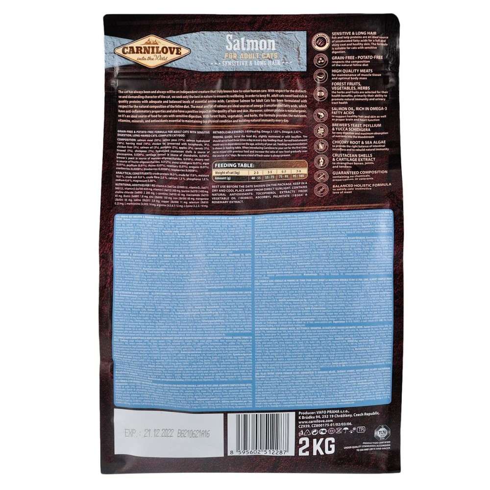 Щоб зберегти відмінну форму, дорослим кішкам необхідна якісна білкова їжа зі збалансованим рівнем незамінних амінокислот. Корм Carnilove Salmon для дорослих кішок створений з урахуванням природного раціону кішок в дикій природі. М'ясо і жир лосося - ідеальні джерела ненасичених жирних кислот омега-3, які мають протизапальні властивості і роблять позитивний вплив на стан вовни і шкіри.