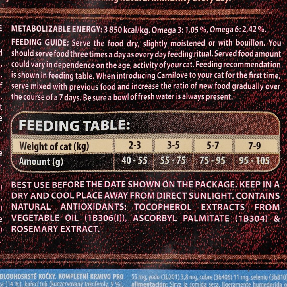 Харчові добавки на 1 кг: вітамін A (3a672a) 23 000 МО, вітамін D3 (3a671) 940 МО, вітамін E (3a700) 650 мг, вітамін C (3a312) 300 мг, таурин (3a370) 2 400 мг, холіну хлорид (3a890) 2 200 мг, L-карнітин (3a910) 65 мг, ніацинамід (3a315) 45 мг, біотин (3a880) 1,8 мг, цинк (3b606) 150 мг, залізо (3b106) 48 мг, марганець (E5) 55 мг, йод (3b201) 3,8 мг, мідь (3b406) 11 мг, селен (3b810) 0,23 мг, L-метіонин (3c305) 14 мг, аргінін (3c3.6.1) 12 мг, L-лізин (3.2.3.) 10 мг.