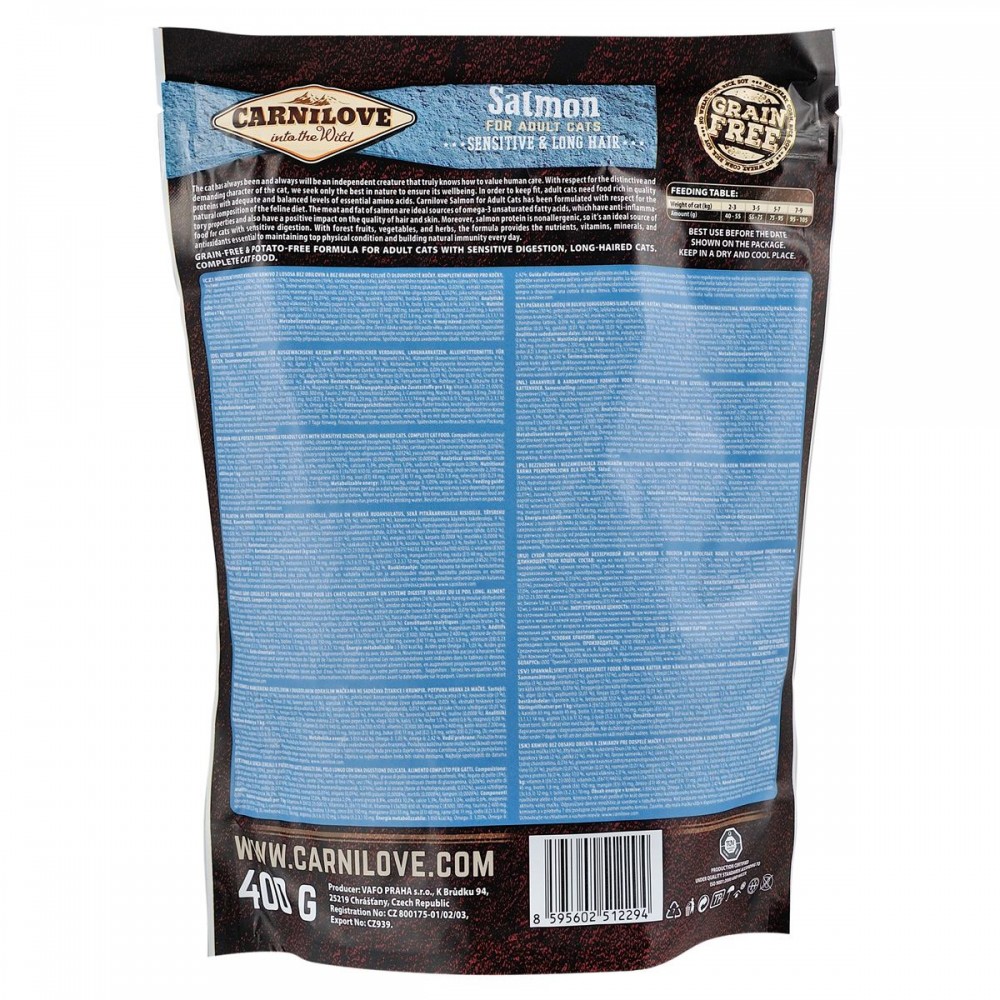 Більш того, гіпоалергенний білок в м'ясі лосося є ідеальним джерелом харчування для кішок з чутливим травленням. Корм містить лісові фрукти, овочі і трави, щодня забезпечуючи Ваших вихованців поживними речовинами, вітамінами, мінералами і антиоксидантами, необхідними для підтримки відмінного фізичного стану і прекрасного природного імунітету.