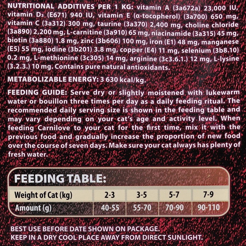 Харчові добавки на 1 кг: вітамін А (3a672a) 23,000 I.U., вітамін D3 (3a671) 940 I.U., вітамін E (3a700) 650 мг, вітамін C (3a312) 300 мг, таурін (3a312) 2,400 мг, холін хлорид (3a890) 2,200 мг, L-карнітин (3a910) 65 мг, ніацинамід (3a910) 45 мг, біотин (3a880) 1.8 мг, цинк (3b606) 100 мг, залізо (3b106) 48 мг, манган (3b504) 55 мг, йод (3b201) 3.8 мг, мідь (3b406) 11 мг, селен (3b810) 0,2 мг, L-метіонін (3c305) 14 мг, аргінін (3c3.6.1.) 12 мг, L-лізин (3.2.3.) 10 мг.