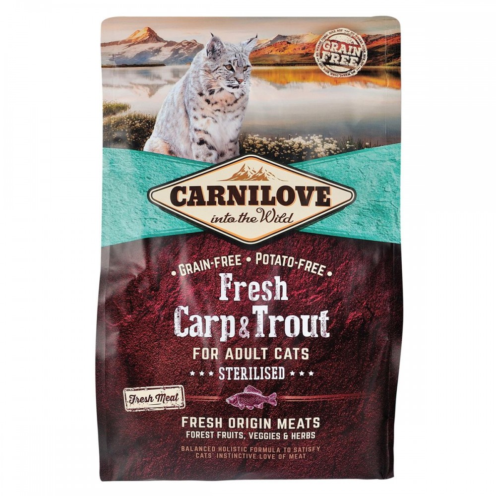 Carnilove Fresh Carp & Trout створено з повагою до законів природи, забезпечуючи вашого кота збалансованим харчуванням, багатим рибою та морепродуктами у поєднанні з різноманітними овочами, ягодами та травами. Мінеральні речовини, які містяться в кормі, підтримують нормальну роботу нирок і сечовивідної системи, а натуральні антиоксиданти, отримані з фруктів і трав, мають очищаючі та протизапальні властивості. Повернення до природного раціону допомагає підтримувати стерилізованих котів у відмінній фізичній формі.