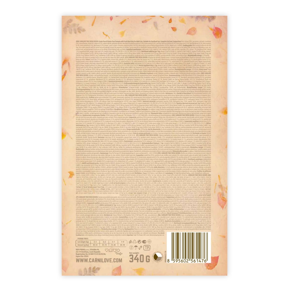 Склад: свіжа курка (70%), гороховий протеїн, червона сочевиця, гречка (4%), природні ароматизатори, курячий жир, лососева олія (1%), хлорид натрію, хлорид калію, сушена ламінарія (Ascophyllum nodosum, 0,5%), протеїн з ряски (Lemna) (0,5%), горохова мука, сушена обліпиха (0,2%), сушений корінь імбирю (0,1%), сушена чорниця (0,1%), сушений розмарин (0,1%), сушена журавлина (vaccinium oxycoccos) (0,1%), сушений чебрець (0,1%), пивні дріжджі (джерело маннанолігосахаридів, 0,015%), корінь цикорію (джерело фруктоолігосахаридів, 0,015%), юкка Шидігера (0,008%).