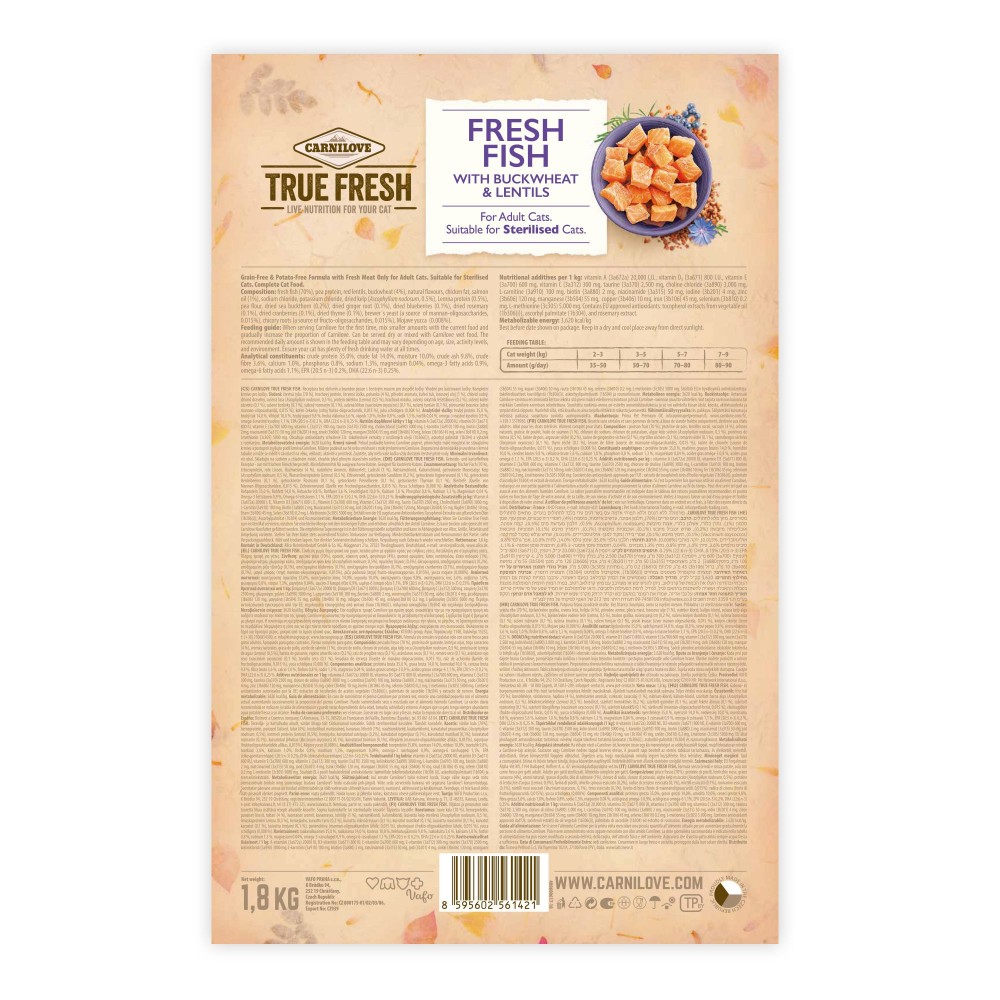 Склад: свіжа риба (70%), гороховий протеїн, червона сочевиця, гречка (4%), натуральні ароматизатори, курячий жир, лососева олія (1%), хлорид натрію, хлорид калію, сушена ламінарія (Ascophyllum nodosum, 0,5%), протеїн з ряски (Lemna) (0,5%), горохова мука, сушена обліпиха (0,2%), сушений корінь імбирю (0,1%), сушена чорниця (0,1%), сушений розмарин (0,1%), сушена журавлина (vaccinium oxycoccos) (0,1%), сушений чебрець (0,1%), пивні дріжджі (джерело маннанолігосахаридів, 0,015%), корінь цикорію (джерело фруктоолігосахаридів, 0,015%), юка Мохаве (0,008%).