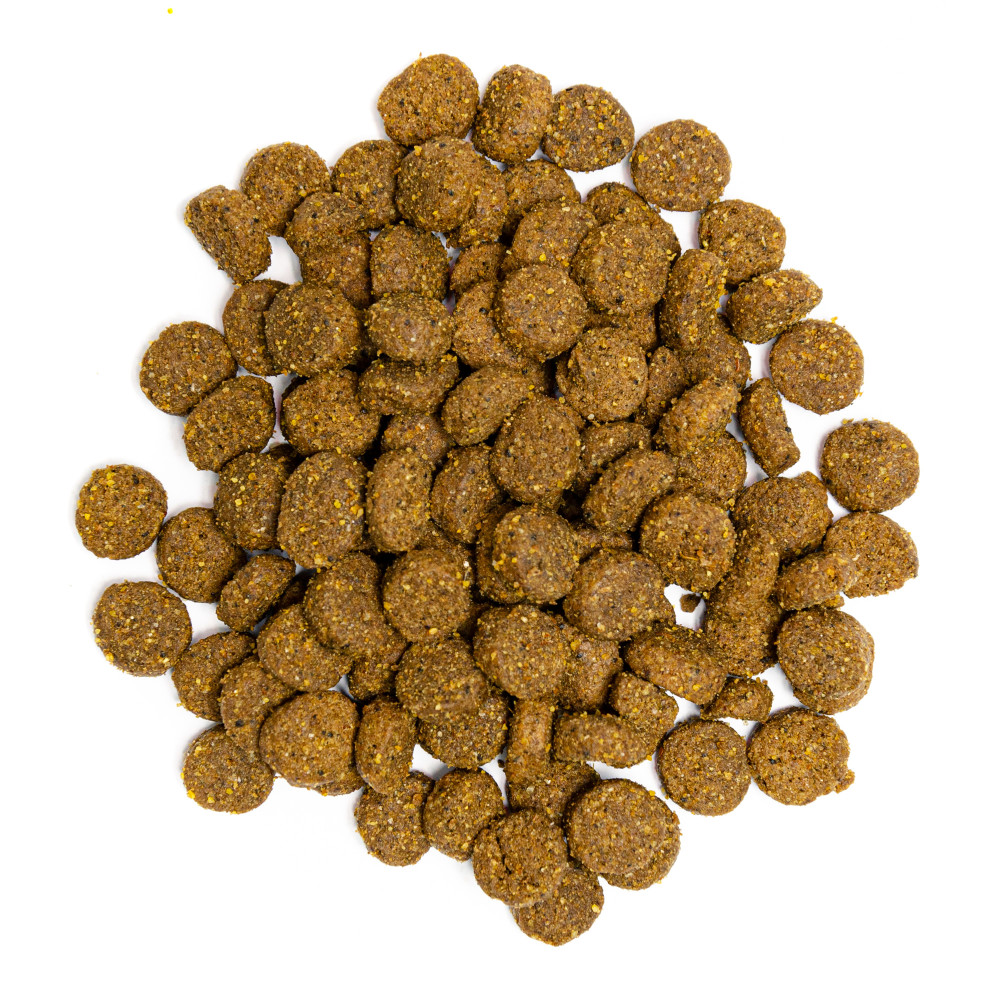 Склад: курка 40% (дегідратована курка 20%, борошно з м’яса курки 20%), кукурудза, картопля (20%), курячий жир (консервований сумішшю токоферолів, джерело вітаміну E) (8%), сушені яблука, пивні дріжджі, гідролізована куряча печінка (2%), борошно з креветок (1,5%), лососева олія (1%), морські водорості (0,5%), сульфат глюкозаміну (0,02%), корінь цикорію (джерело маннанолігосахаридів 0,018%), трав’яна суміш (фенхель, базилік, шавлія 0,018%), фруктоолігосахариди (0,012%), сульфат хондроїтину (0,012%) екстракт юки (Yucca schidigera) (0,01%).
