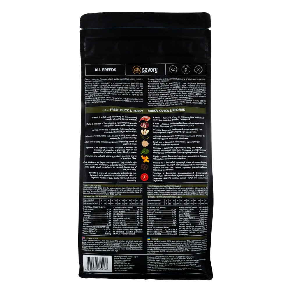 Сухий корм для собак усіх порід Savory містить якісне м’ясо качки та кролика, суперфуди, яблука, гарбуз і куркуму. Ці компоненти створені природою для оптимальної кондиції, здорових суглобів і розкішного вигляду песика.
