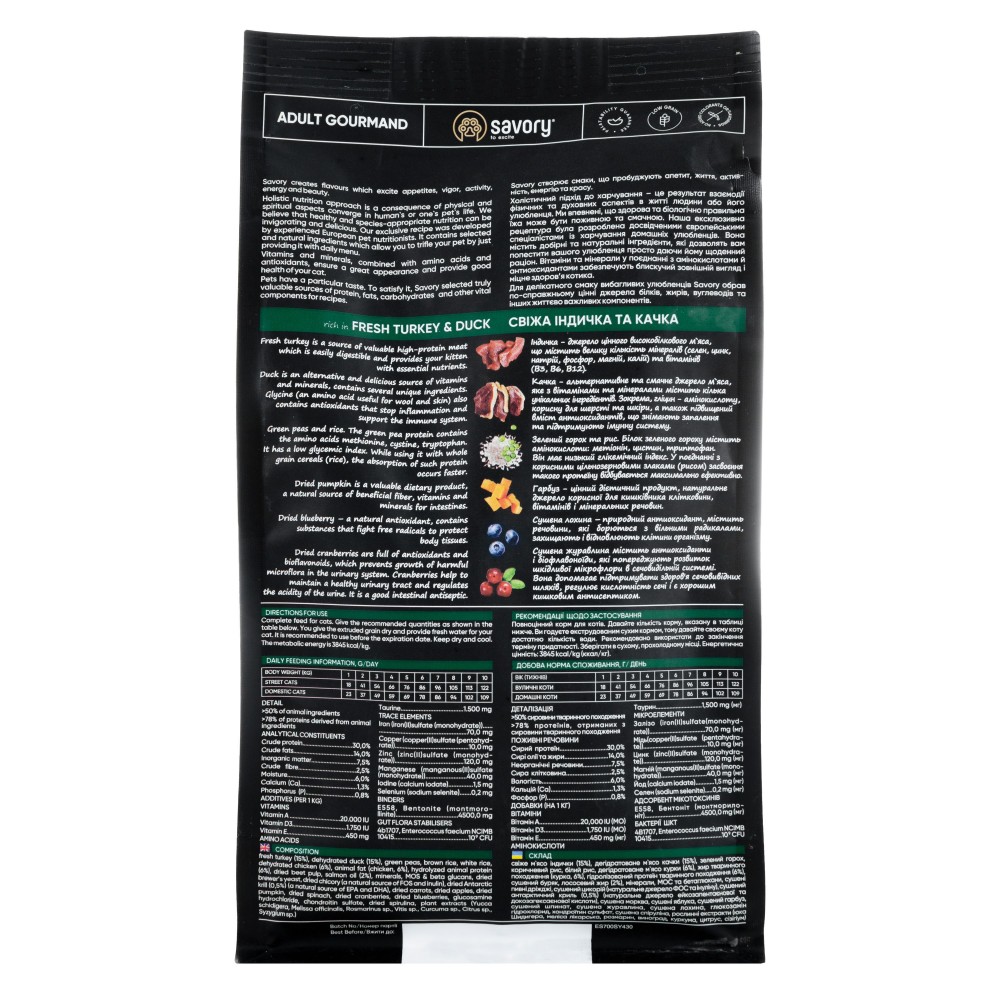 Сухий корм для котів Savory містить свіже м'ясо індички і дегідратоване м'ясо качки, ягоди, фрукти та овочі. Ці компоненти створені природою, щоб забезпечити котику для міцне здоров’я та енергію для щоденних розваг.