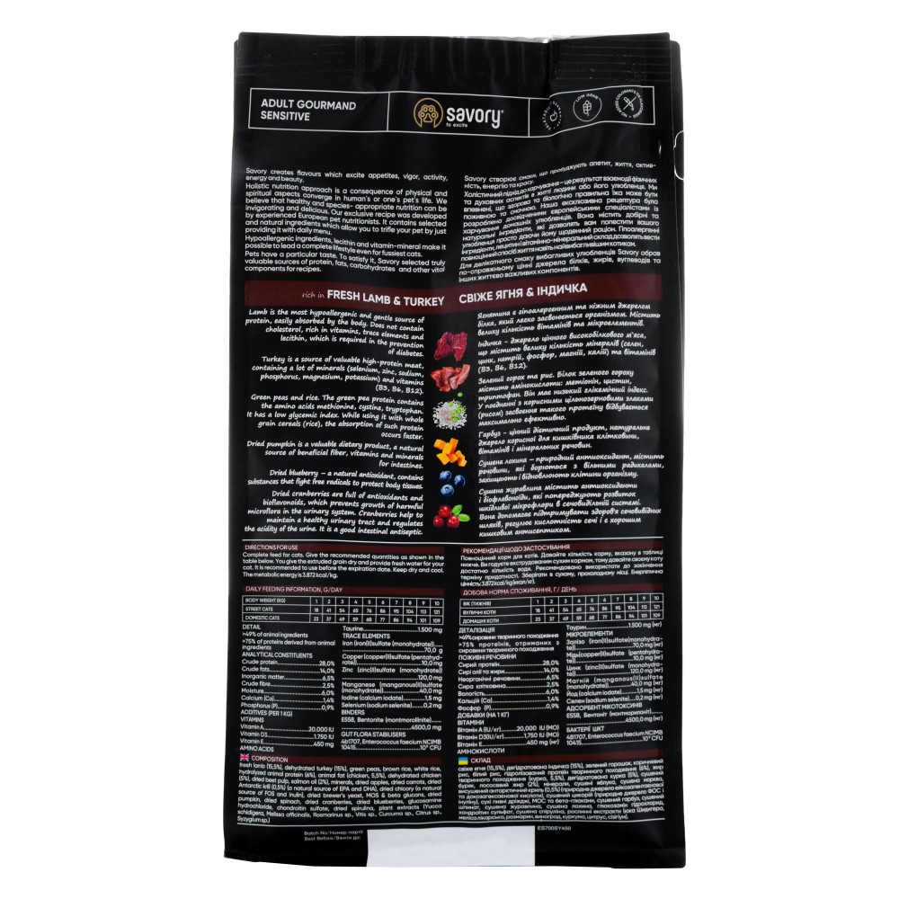 Сухий корм для котів Savory містить свіже м'ясо ягняти та дегідратоване м'ясо індички, ягоди, фрукти та овочі. Ці компоненти створені природою, щоб котик зміг втамувати голод, отримавши необхідні поживні речовини без ризику виникнення алергії.