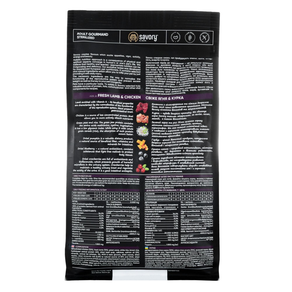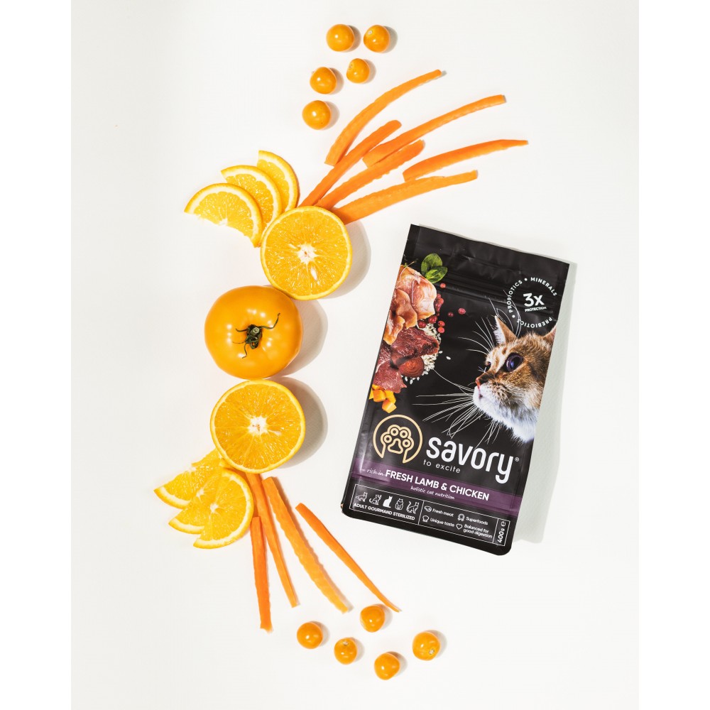 Сухий корм для котів Savory містить свіже м'ясо ягняти та дегідратоване м'ясо курки, ягоди, фрукти та овочі. Ці компоненти створені природою, щоб піклуватися про здоров’я нирок і сечовивідних шляхів котика та підтримати його оптимальну фізичну форму.