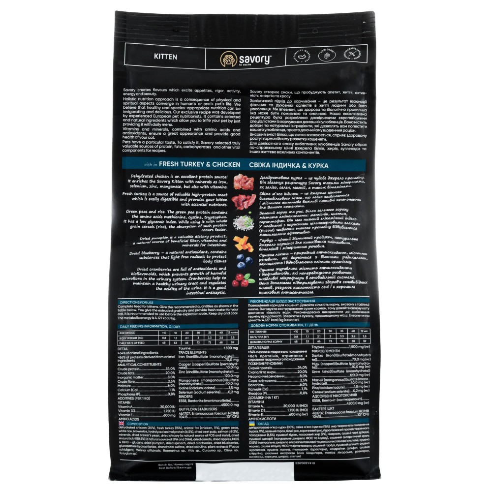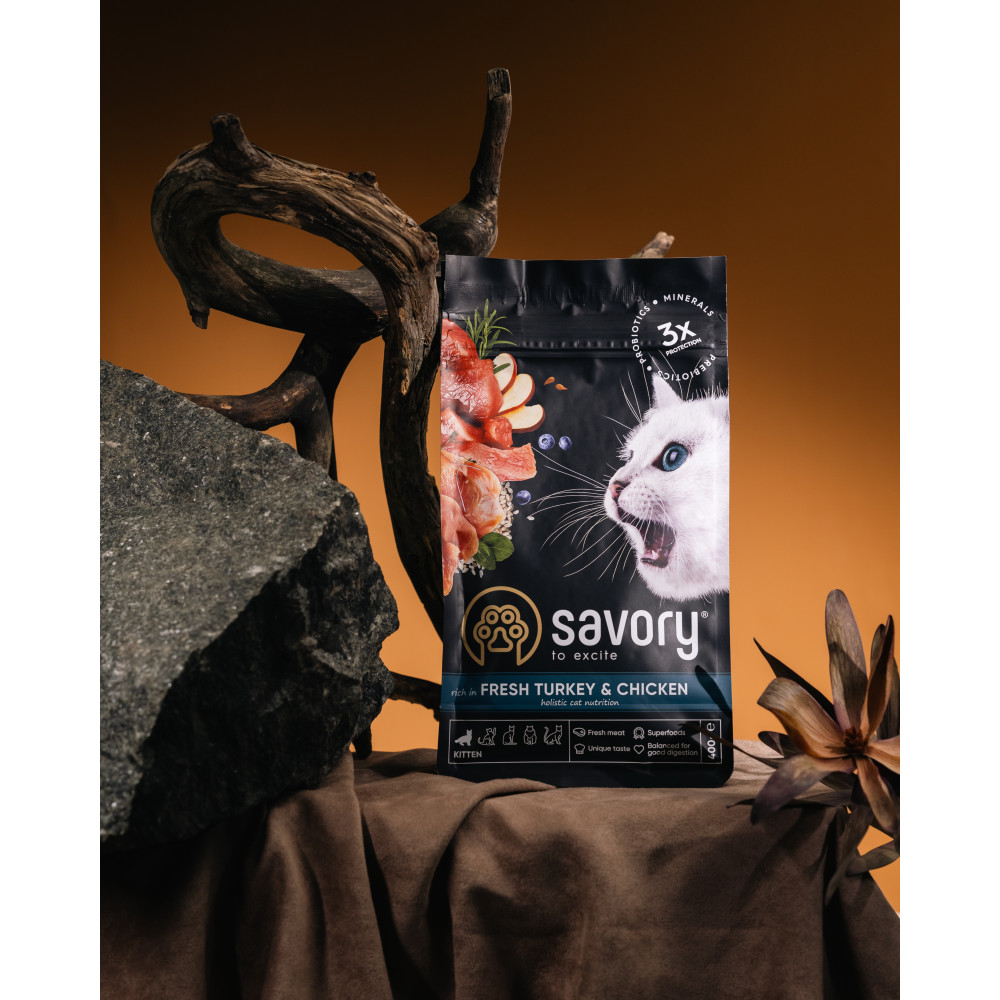 Сухий корм для кошенят Savory містить свіже м'ясо індички та дегідратоване м'ясо курки, ягоди, фрукти та овочі. Ці компоненти створені природою, щоб організм малюків отримав необхідні поживні речовини для зміцнення імунітету, правильного розвитку та здорового росту.