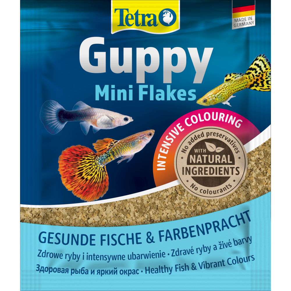 Комплексний корм у вигляді дрібних пластівців для всіх гупі та інших живородних риб, таких як пецилії, молінезії та мечоносці.