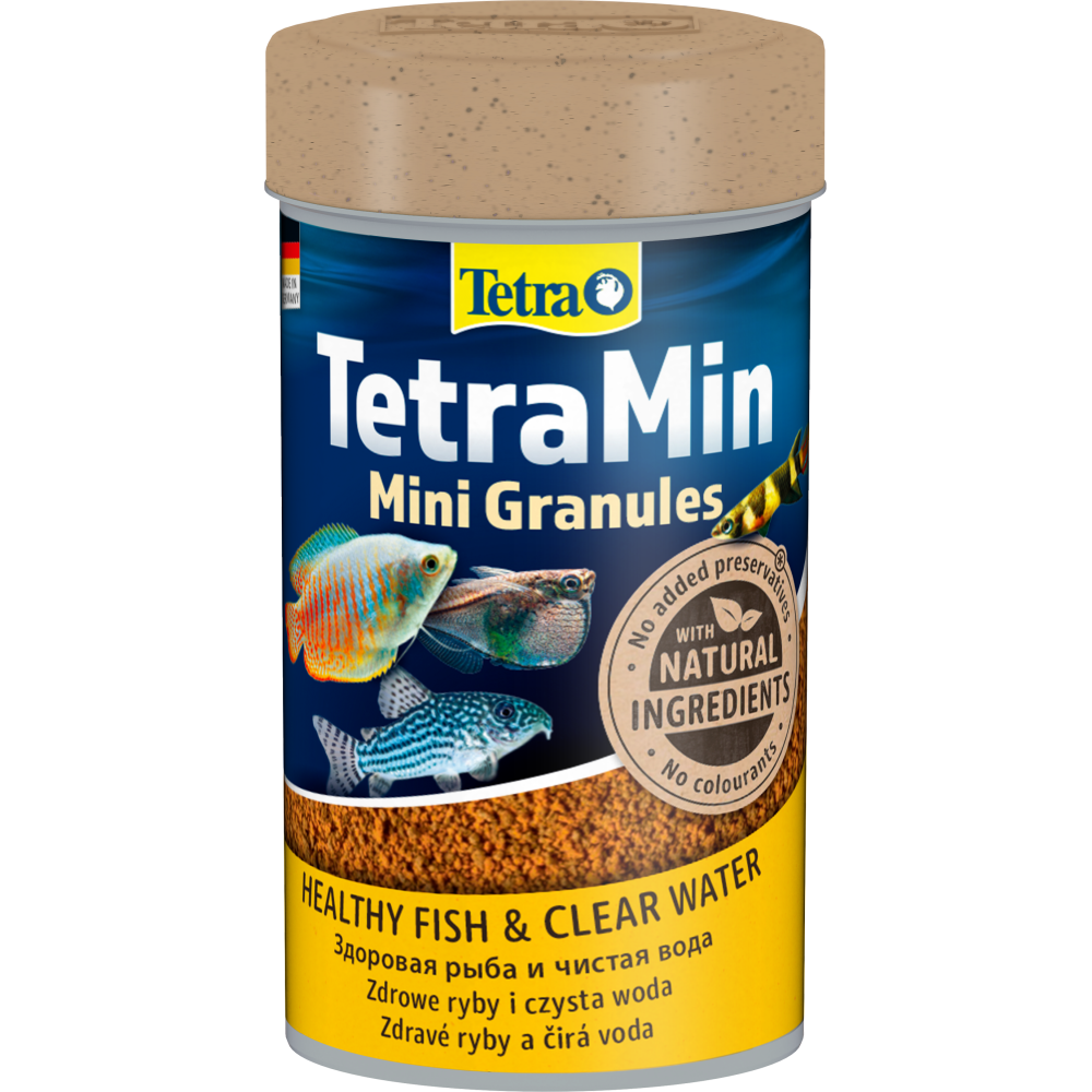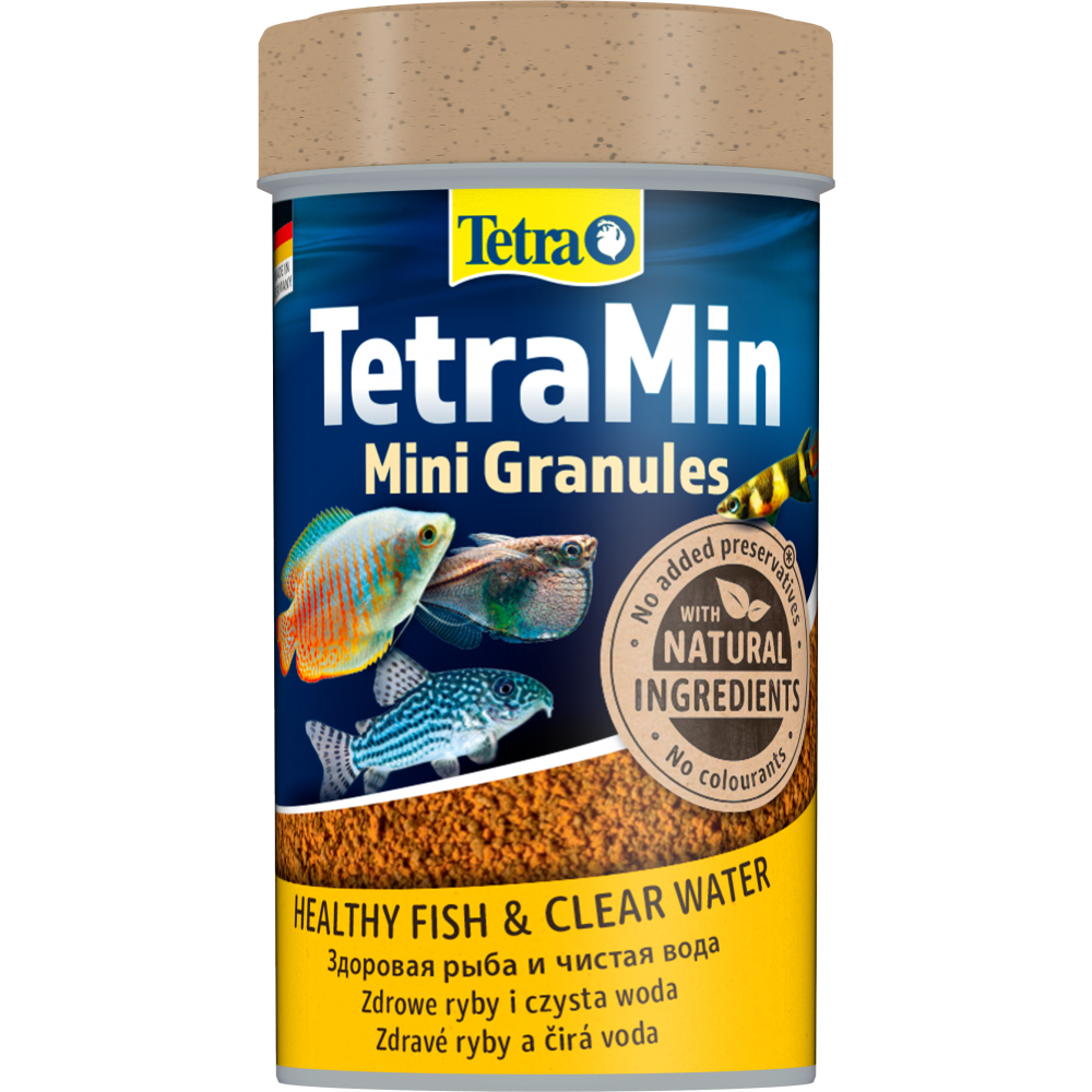 - Повноцінний корм у формі міні гранул для невеликої прісноводної декоративної риби.