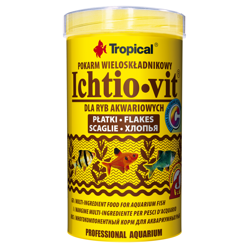 Багатокомпонентний корм у вигляді пластівців, отриманий з високоякісних, добірних, компонентів тваринного і рослинного походження. Призначений для щоденного годування всеїдних риб. Оптимально збалансований склад і відповідний набір вітамінів і мікроелементів забезпечує правильний ріст і розвиток риб, а також покриває їх енергетичні потреби. Ichtio-vit особливо охоче використовують у промисловому рибництві, поряд зі спеціальними кормами лінії premium та professional.