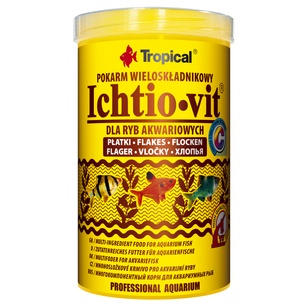 Багатокомпонентний корм у вигляді пластівців, отриманий з високоякісних, добірних, компонентів тваринного і рослинного походження. Призначений для щоденного годування всеїдних риб. Оптимально збалансований склад і відповідний набір вітамінів і мікроелементів забезпечує правильний ріст і розвиток риб, а також покриває їх енергетичні потреби. Ichtio-vit особливо охоче використовують у промисловому рибництві, поряд зі спеціальними кормами лінії premium та professional.