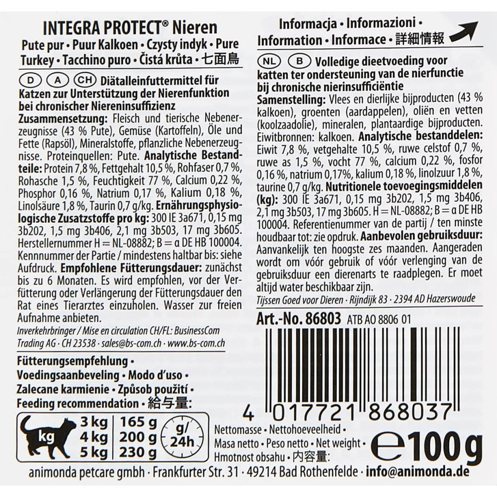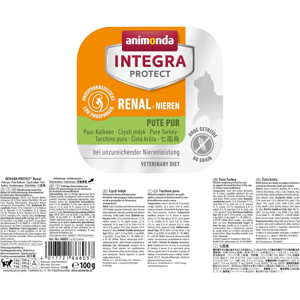 INTEGRA PROTECT Renal з індичкою – спеціальний дієтичний корм суперпреміум класу для котів із захворюваннями нирок. Цей раціон містить значно менше фосфору і білка в порівнянні зі звичайним кормом