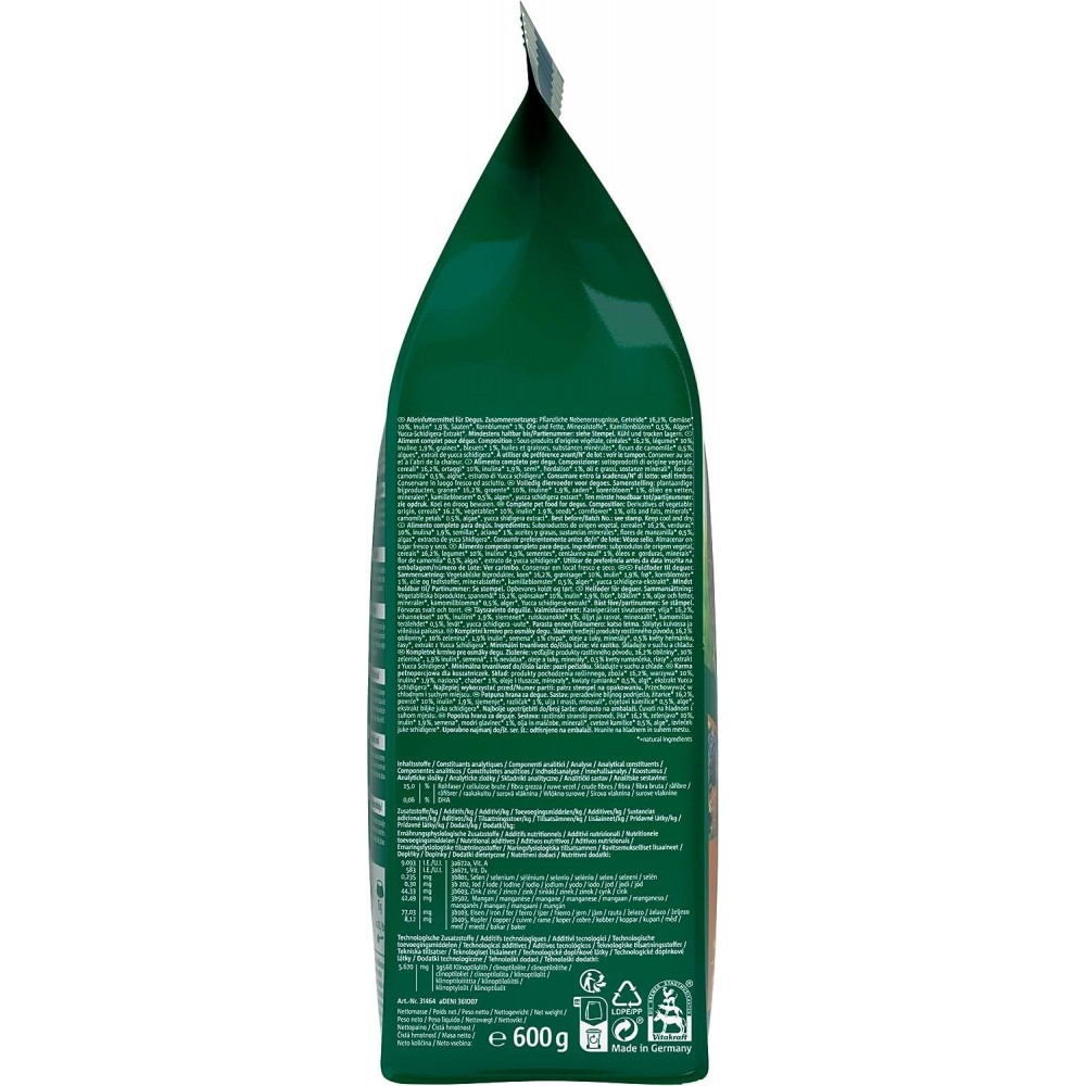 Збалансована основна кормова суміш орієнтована на потреби дегу – це і багаті клітковиною гранули люцерни, і апетитний топінамбур, і надзвичайно корисні квіти.