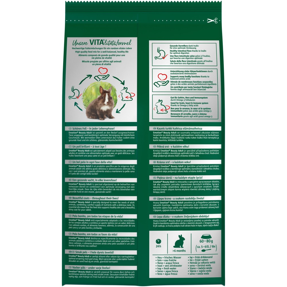 Корм для довгошерстих кроликів Emotion Beauty застосовується в якості збалансованого харчування. При регулярному прийомі корму підвищується активність домашнього улюбленця, забезпечується здоровий та повноцінний розвиток. В складі продукту містяться Омега – 3 жирні кислоти (для нормалізації роботи серця, мозку, зміцнення імунної системи, корисні масла, що покращують блиск шерсті, роблять шкіру здоровою, метіонін (покращує ріст шерсті), пребіотик (для покращення травлення), а також: