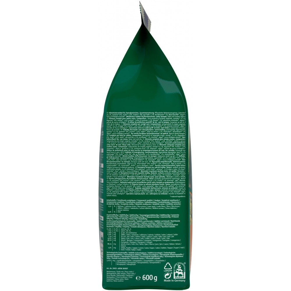 Склад: похідні рослинного походження, злаки 20,9%, овочі 16,6%, інулін 2%, насіння, олії та жири 0,91%, волошка 1%, мінерали, морські водорості, екстракт юки Шидигера.