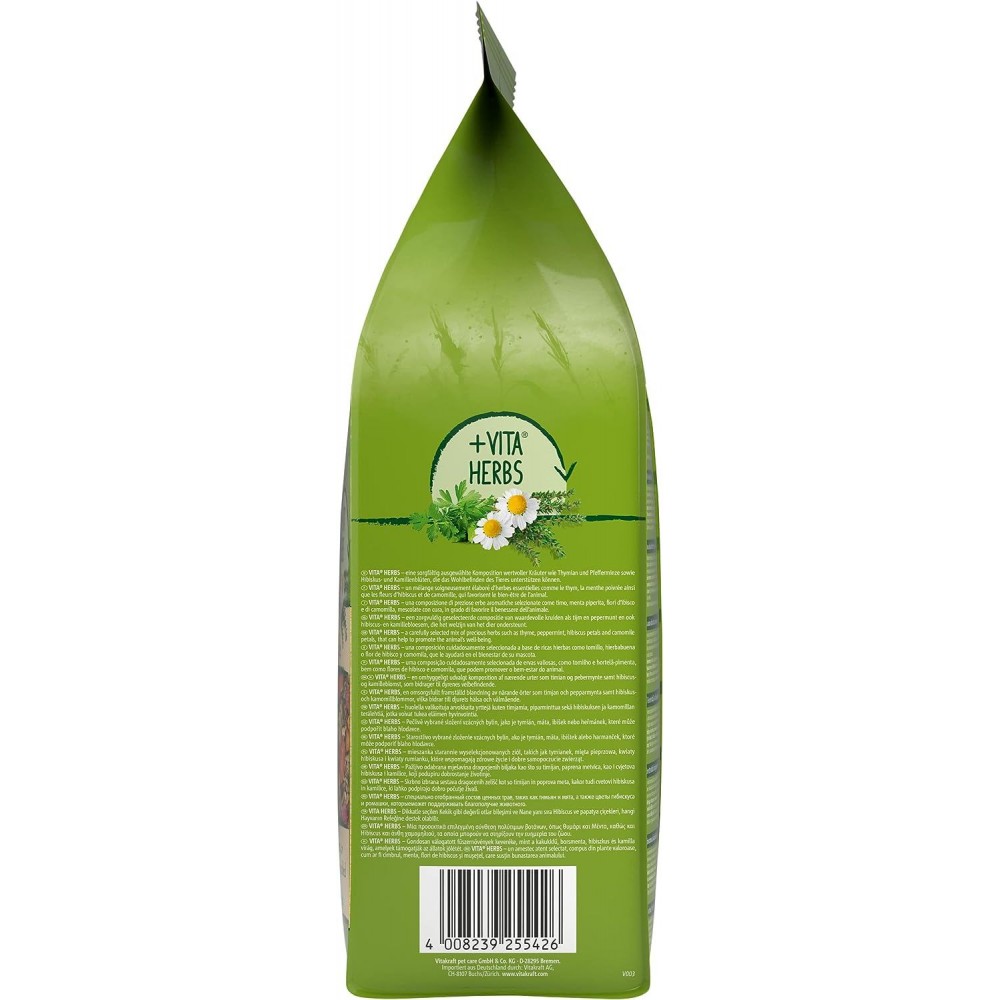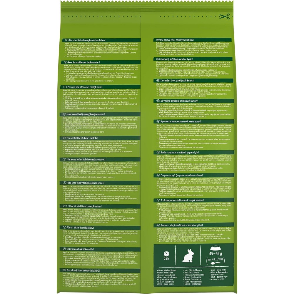 Меню Vital для дорослих кроликів є збалансованим раціоном, в складі якого Ваш вихованець знайдете все необхідне для свого здорового і тривалого життя. Корм містить люцерну, багату на волокна, ароматні яблука, корисні злаки, смачні овочі. Всі необхідні Вітаміни, мінерали та мікроелементи сприяють відмінному стану Вашого кролика.