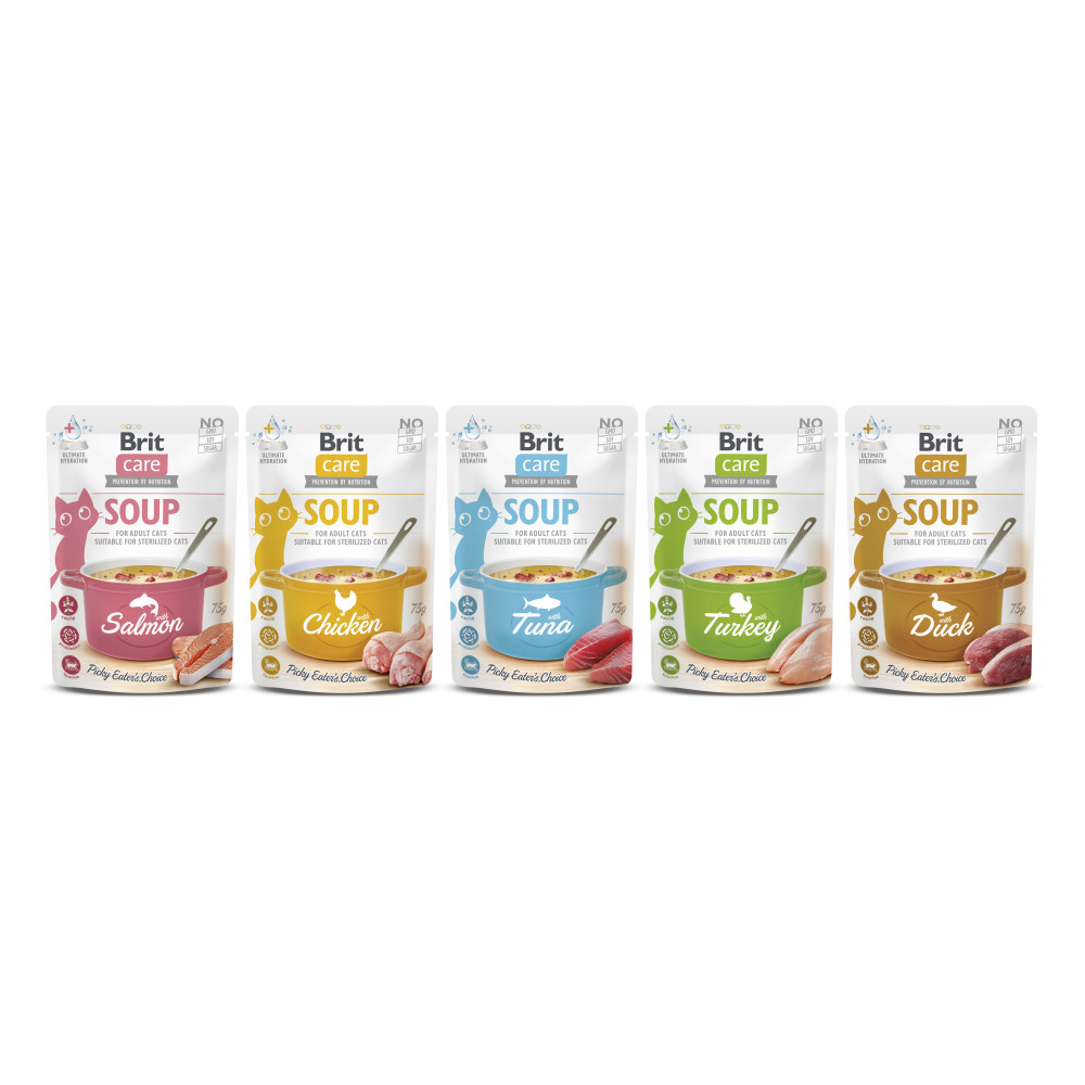 В ідеалі коти мають випивати приблизно 50 мл рідини на 1 кг маси тіла щодня. Новий корм-суп Brit Care Cat – це чудовий спосіб підвищити споживання води улюбленцем, що сприятиме здоров'ю сечовивідних шляхів. Також це прекрасне доповнення та урізноманітнення раціону вашого котика