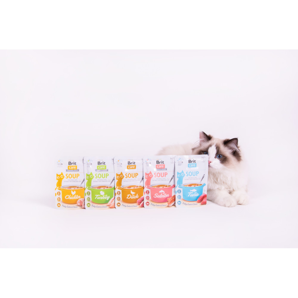 В ідеалі коти мають випивати приблизно 50 мл рідини на 1 кг маси тіла щодня. Новий корм-суп Brit Care Cat – це чудовий спосіб підвищити споживання води улюбленцем, що сприятиме здоров'ю сечовивідних шляхів. Також це прекрасне доповнення та урізноманітнення раціону вашого котика