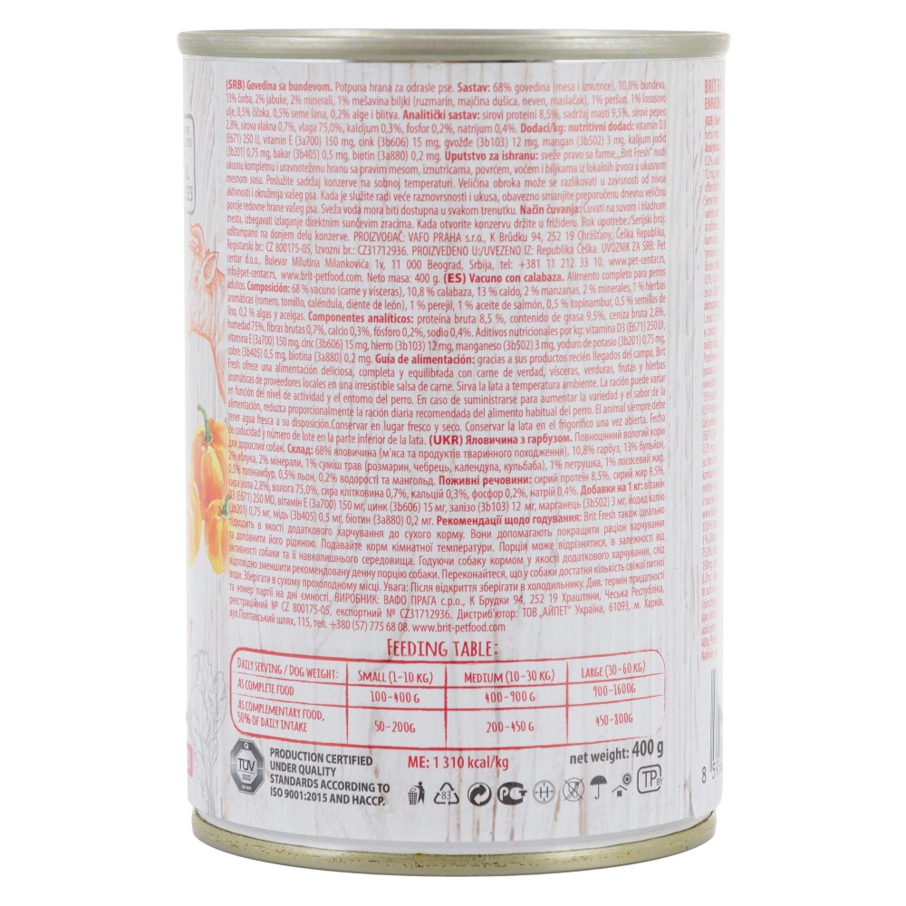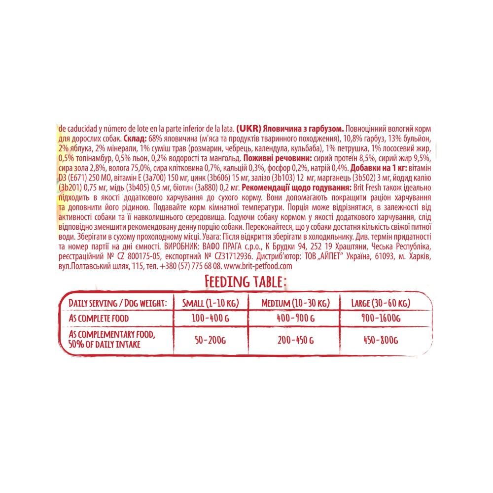 Brit Fresh пропонує делікатесне, комплексне і збалансоване харчування з м'ясом, потрушками, овочами, фруктами та зеленню з місцевих джерел. Виготовлено зі свіжого м'яса, що природно містить у собі м'ясний сік з речовинами, які надають неповторні смакові якості продукту. Повноцінний корм для собак.