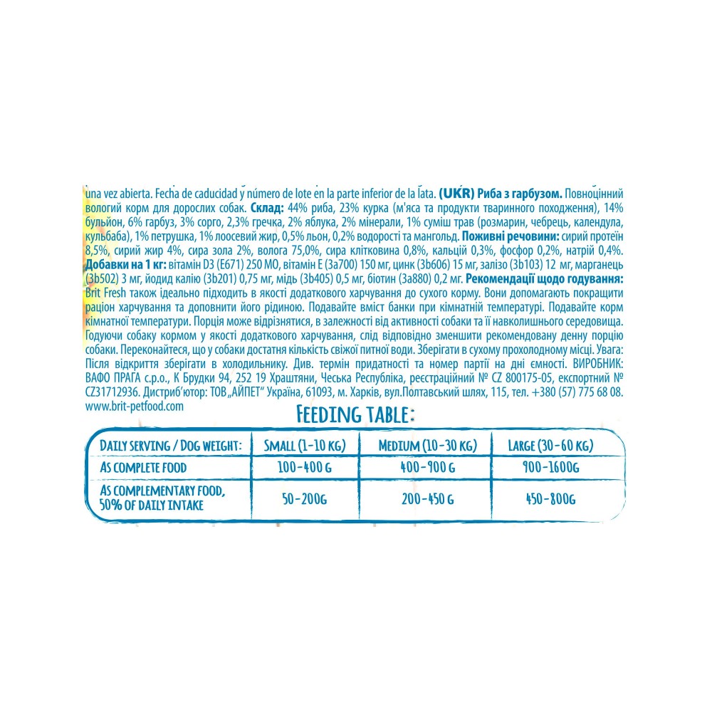Brit Fresh пропонує делікатесне, комплексне і збалансоване харчування з м'ясом, потрушками, овочами, фруктами та зеленню з місцевих джерел. Виготовлено зі свіжого м'яса, що природно містить у собі м'ясний сік з речовинами, які надають неповторні смакові якості продукту. Повноцінний корм для собак.