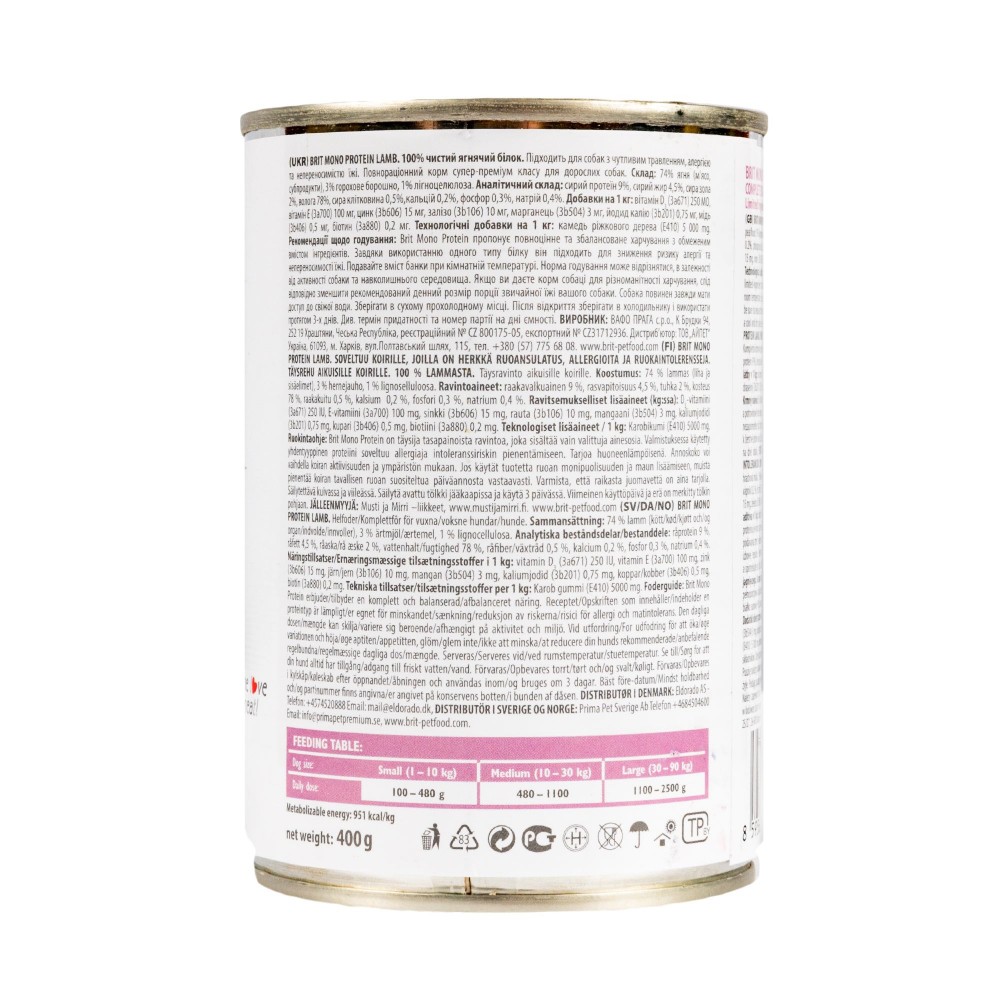 Brit Mono Protein Lamb – повноцінний вологий корм суперпреміум класу для собак. Рецептура з обмеженою кількістю інгредієнтів підходить для зниження ризику алергії та харчової непереносимості.