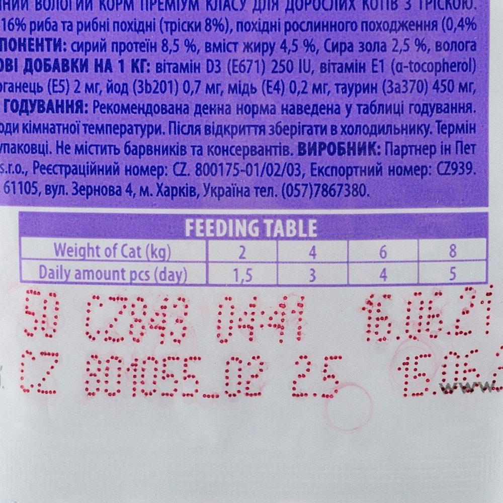 Добавки на 1 кг(kg): вітамін D3 (3a671) 160 МО, вітамін Е (3a700) 100 мг(mg), цинк (3b605) 10 мг(mg), марганець (3b502) 2 мг(mg), йод (3b202) 0,2 мг(mg), мідь (3b405) 1,2 мг(mg), таурин (3a370) 520 мг(mg), біотин 0,1 мг(mg).
