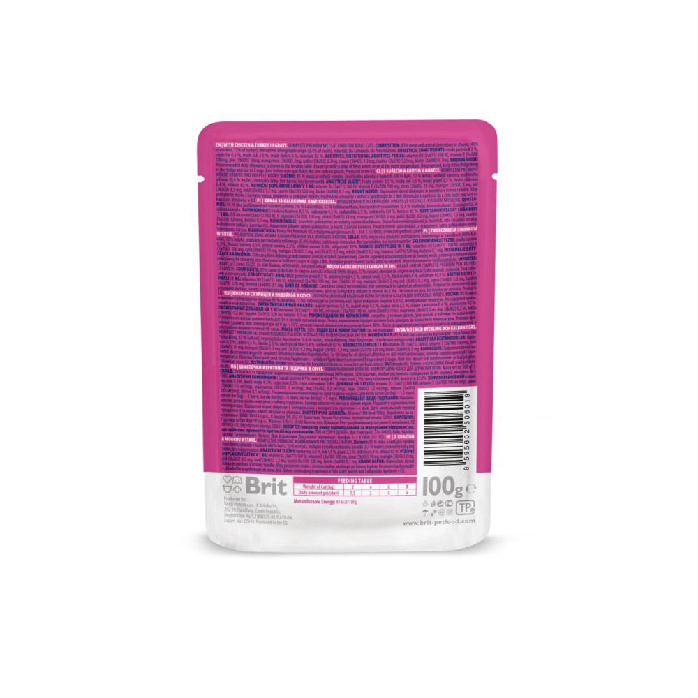 Одна упаковка містить 4 паучі вологого корму (по 100 г кожен): 2 шт. Brit Premium Cat Chicken&Turkey з куркою та індичкою, 2 шт Brit Premium Cat Beef Stew&Peas з тушкованою яловичиною та горошком.