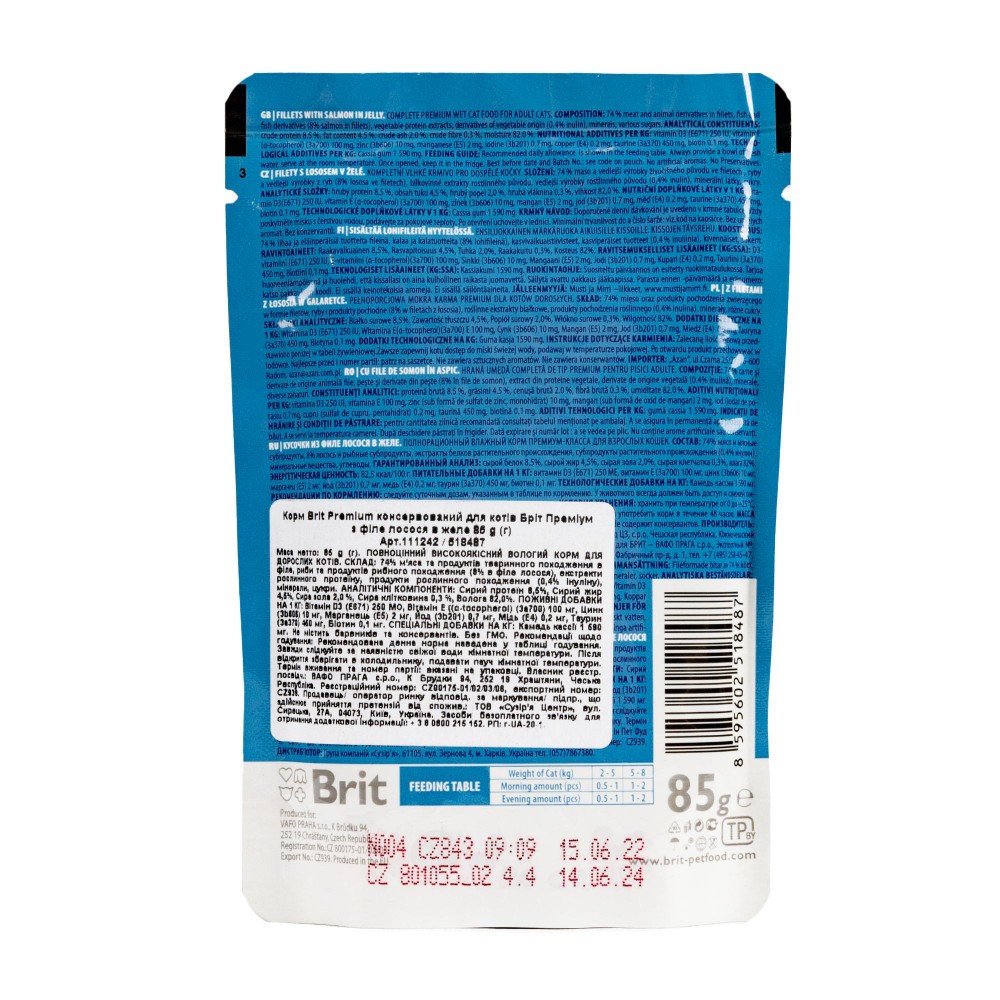 Склад: 74% м‘яса та продуктів тваринного походження в філе, риби та продуктів рибного походження (8% в філе лосося), екстракти рослинного протеїну, продукти рослинного походження (0,4% інуліну), мінерали, цукри.