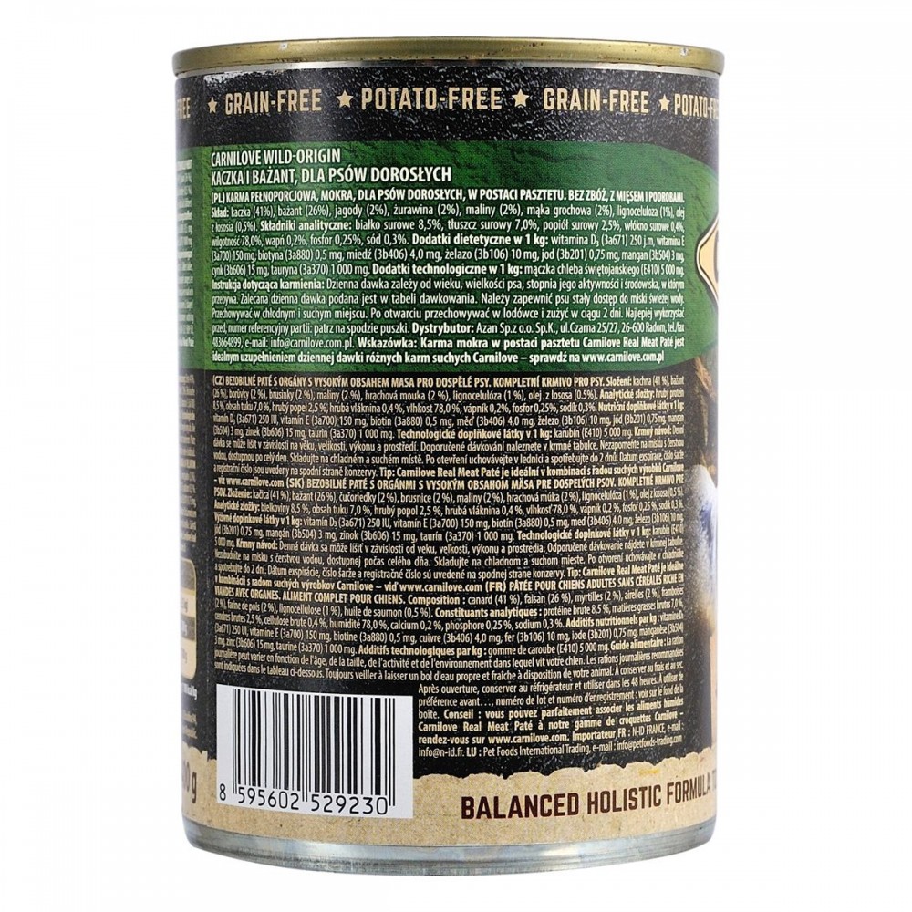 Склад: качка (41%), фазан (26%), чорниця (2%), журавлина (2%), малина (2%), горохова борошно (2%), лігноцелюлоза (1%), лососевий жир (0,5%)