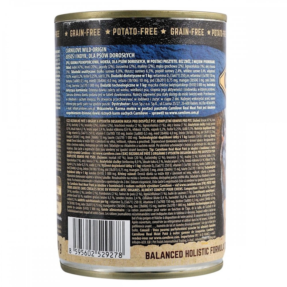 Склад: індичка (47%), лосось (20%), чорниця (2%), журавлина (2%), малина (2%), горохова борошно (2%), лігноцелюлоза (1%), лососевий жир (1%).