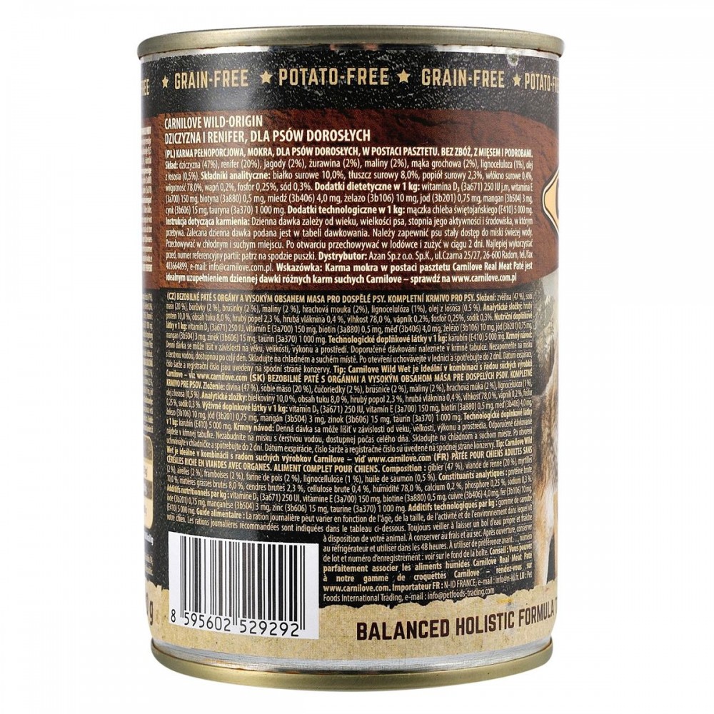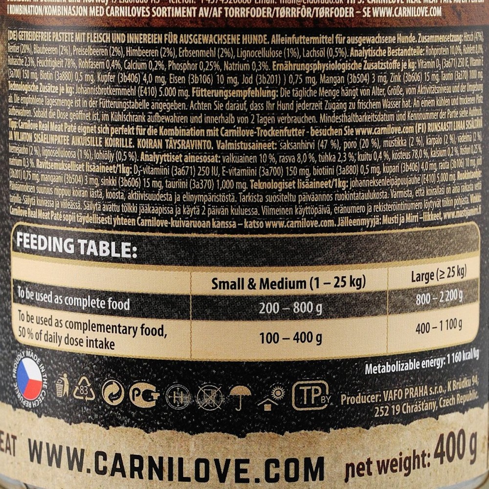 Склад: оленина (47%), північний олень (20%), чорниця (2%), журавлина (2%), малина (2%), горохова борошно (2%), лігноцелюлоза (1%), лососевий жир (0,5%)