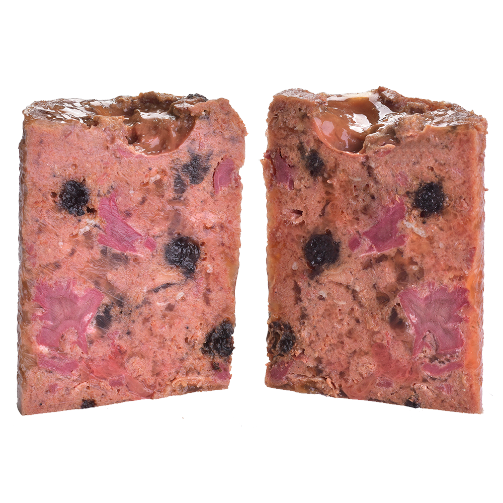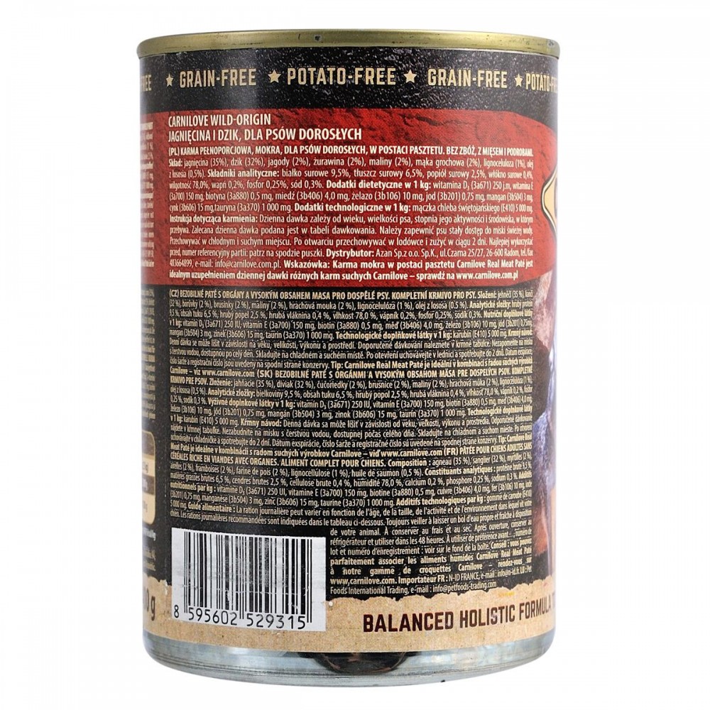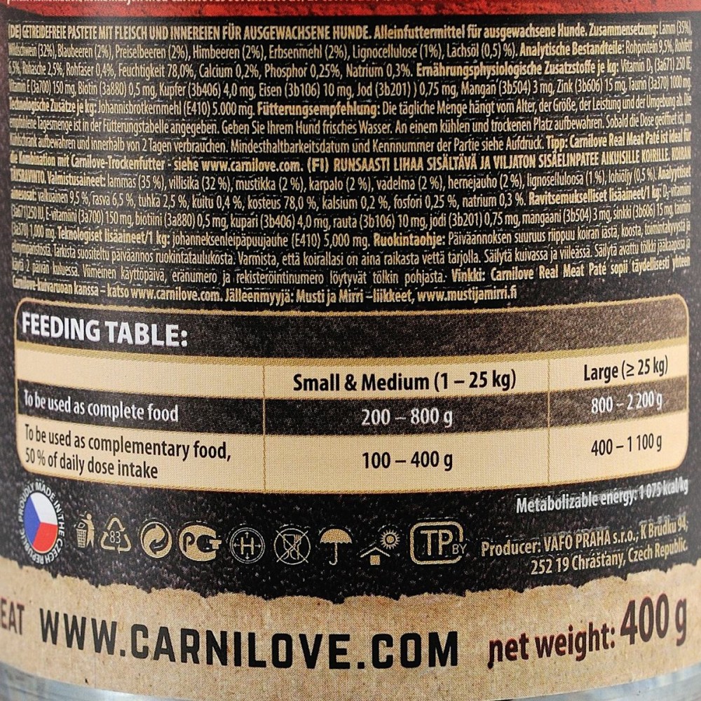 Склад: ягня (35%), кабан (32%), чорниця (2%), журавлина (2%), малина (2%), горохова борошно (2%), лігноцелюлоза (1%), лососевий жир (0,5%)