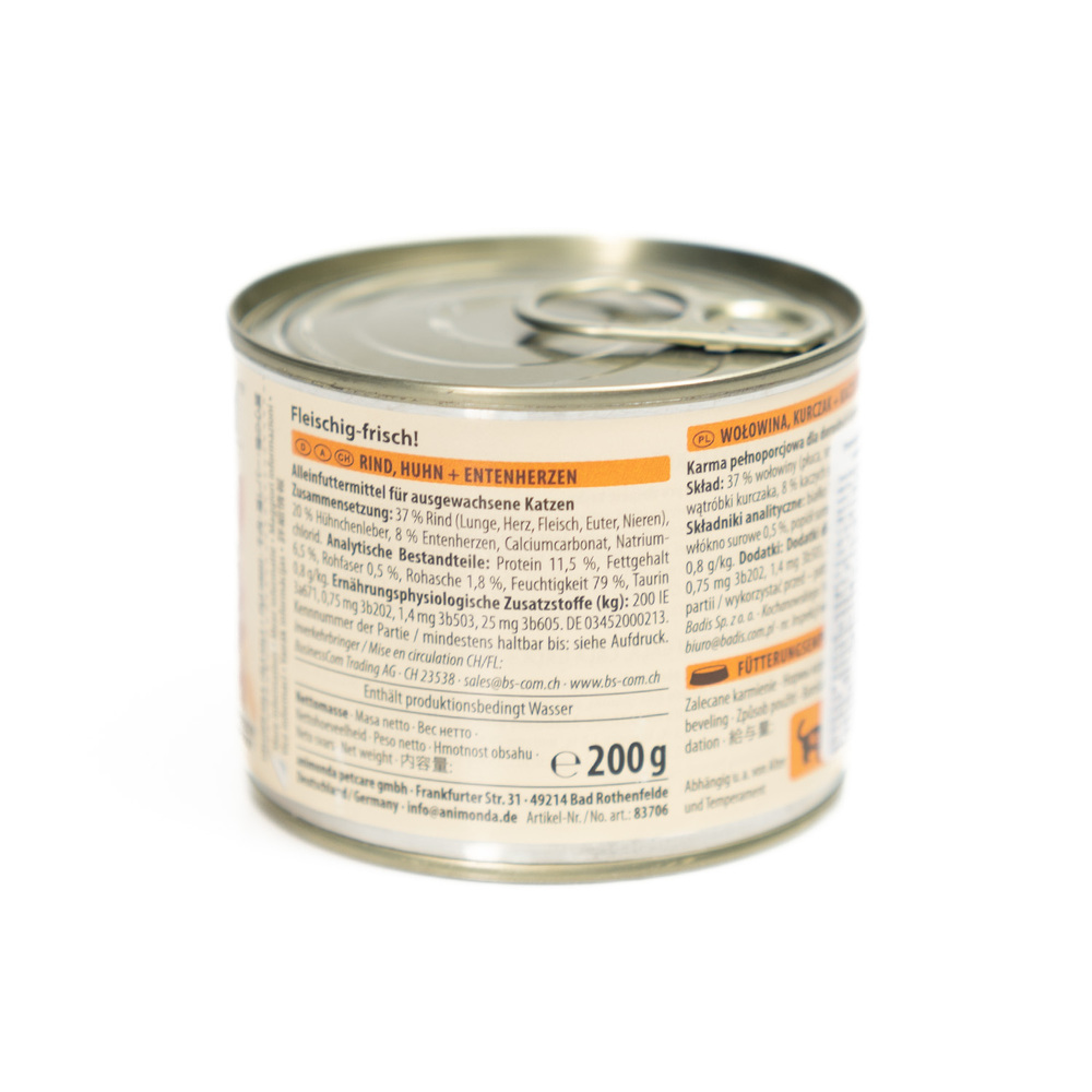 Склад: 35% яловичини (легені, вим'я, м'ясо), 26% курки (печінка, м'ясо, серце), 4% качиних сердець, мінерали, ріпакова олія.