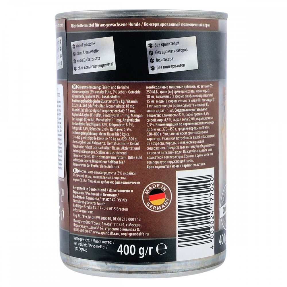 Консерви Edel Dog - це повнораціонний вологий корм для собак всіх порід. До складу корму входить м'ясо індички та печінки. Чудово задовольняє енергетичні потреби організму собаки.