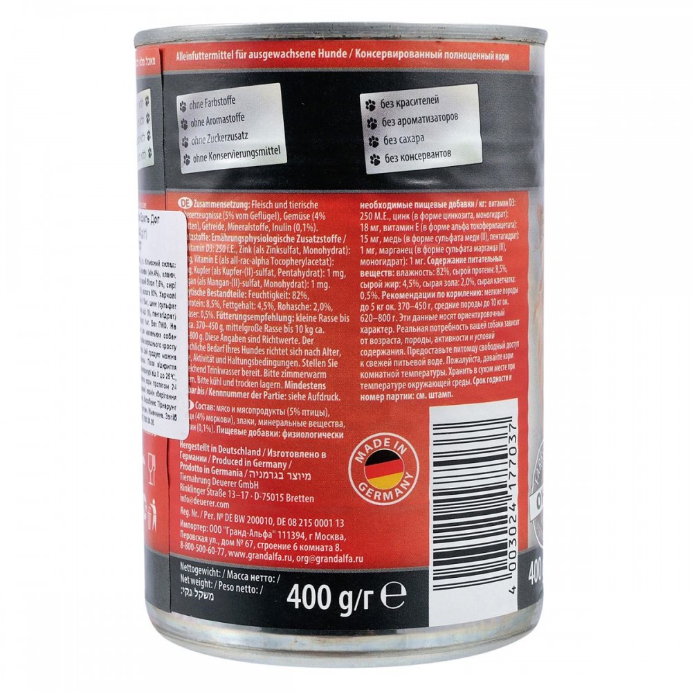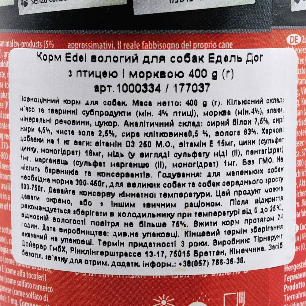 Консерви Edel Dog - це повнораціонний вологий корм для собак всіх порід. До складу корму входить м'ясо птахів та овочів. Чудово задовольняє енергетичні потреби організму собаки.