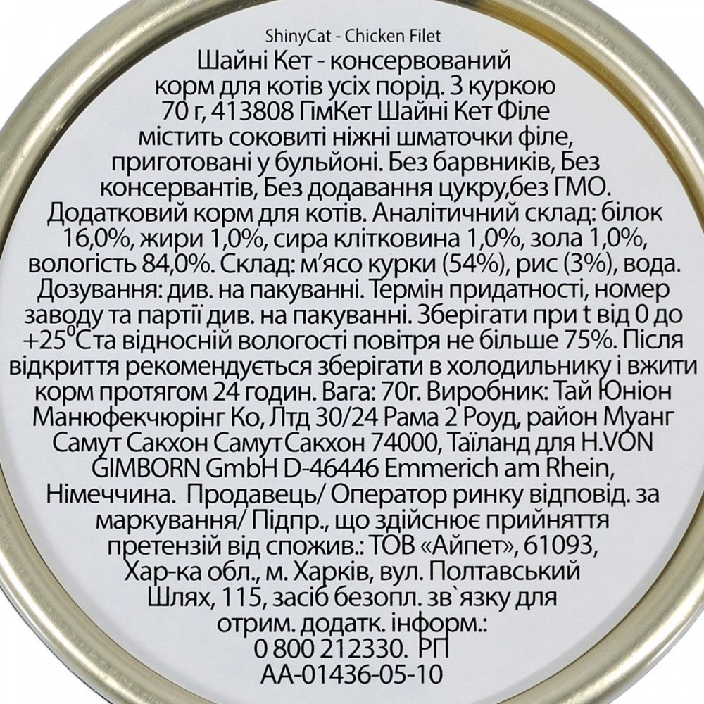 Shiny Cat Filet курка – це ніжні та соковиті шматочки м’яса курки, приготовані в бульйоні, з додаванням рису. Вологий корм суперпреміум класу для котів, збагачений протеїнами, не містить штучних барвників, ароматизаторів, підсилювачів смаку, генно модифікованих складових, консервантів.