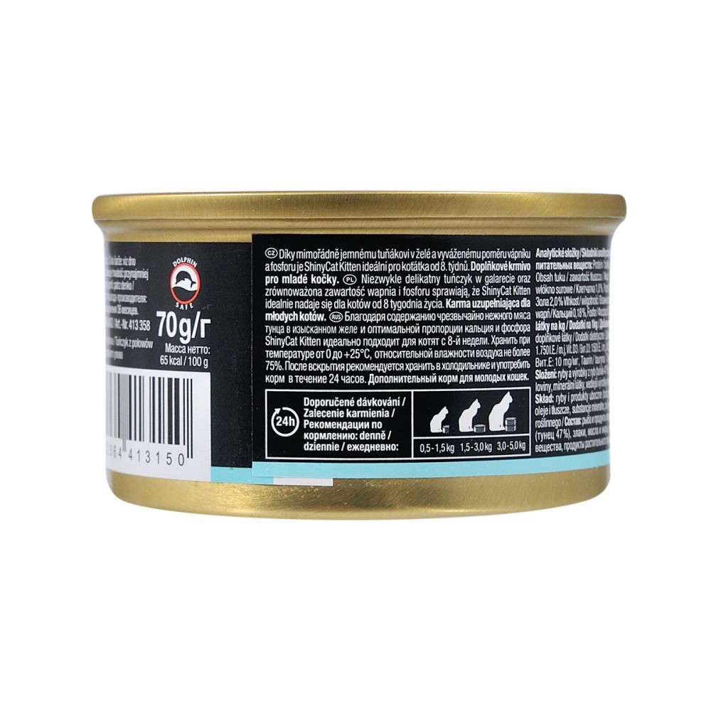 Консерви для кошенят Shiny Cat Kitten тунець – відрізняються збалансованим вмістом кальцію та фосфору та подрібнені на особливо маленькі шматочки, а отже підходять для вживання кошенятами із 8-го тижня життя.