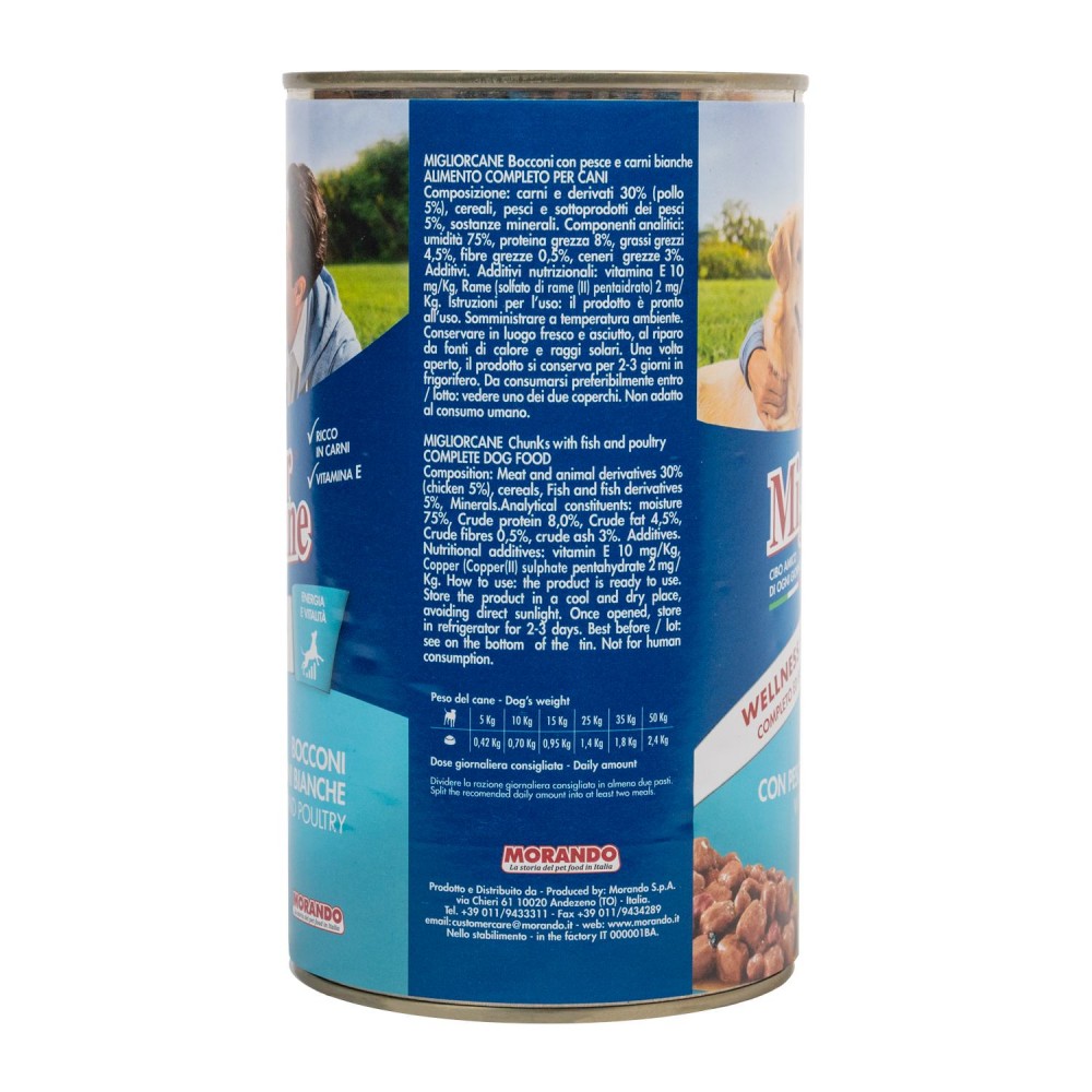 Вологий корм для собак «Migliorcane шматочки з рибою та білим м'ясом» виробляється в Італії за рецептурою, розробленою вченими. Формула цього корму включає всі необхідні вашому песику поживні речовини: