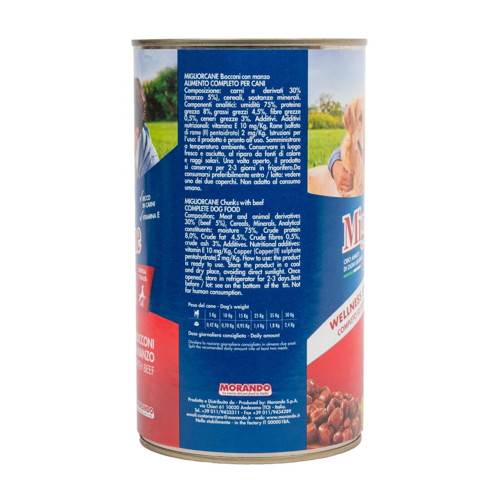 Вологий корм для собак «Migliorcane зі шматочками яловичини» виробляється в Італії за рецептурою, розробленою вченими. Формула цього корму включає всі необхідні вашому песику поживні речовини: